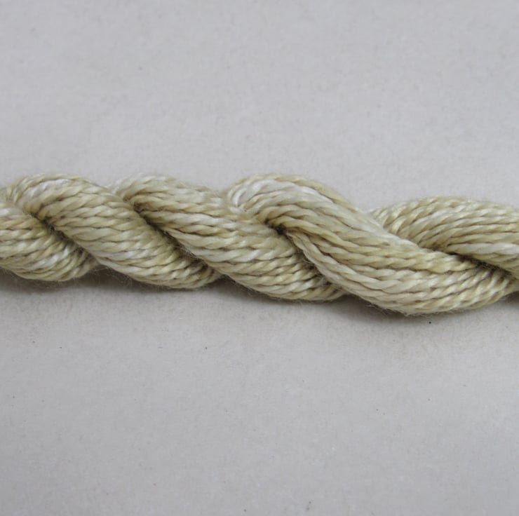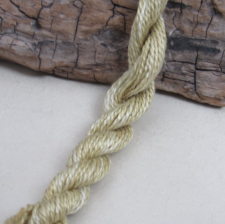 Hand dyed pure silk embroidery thread, dyed with tansy flowers gathered from my garden to give a gentle light green-gold