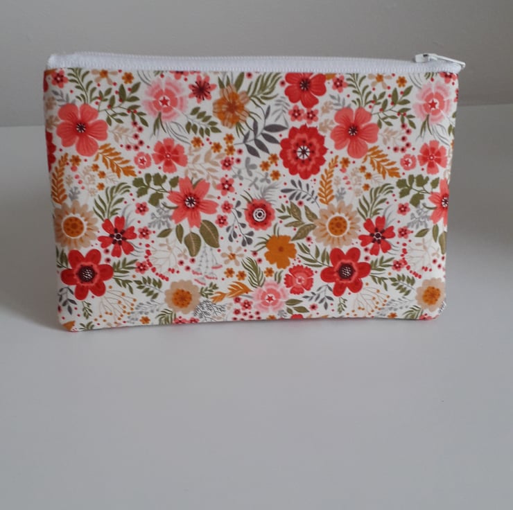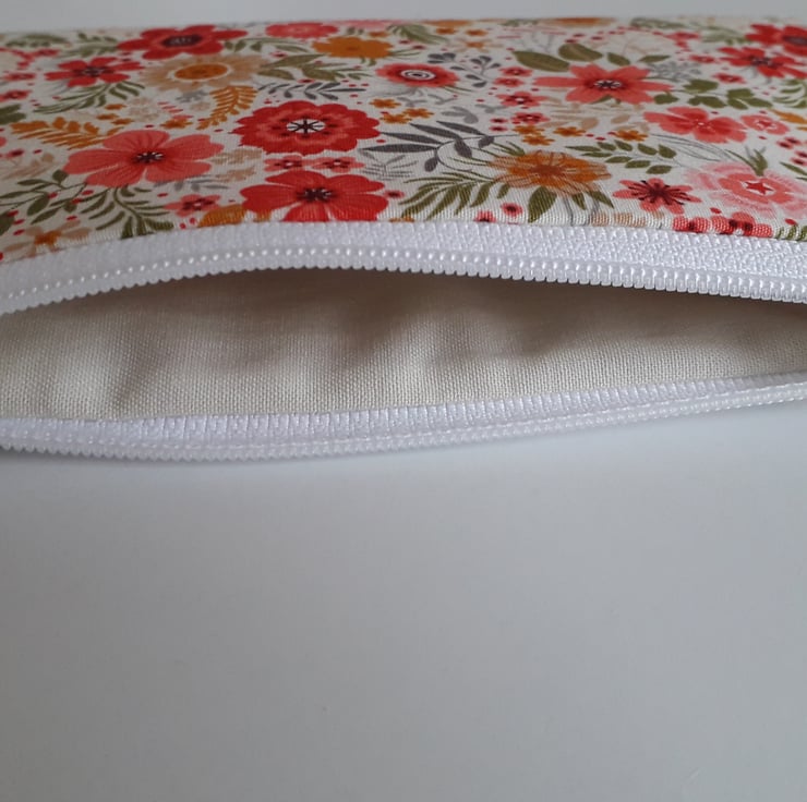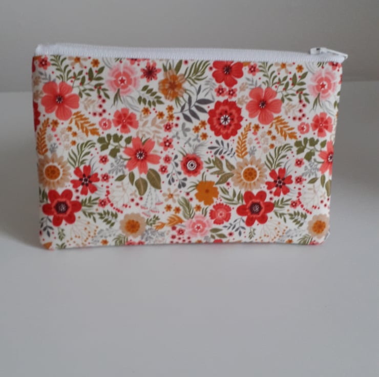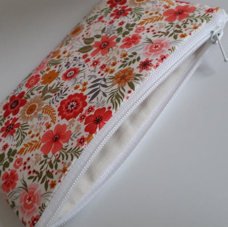 Zipper Pouch made with a Floral style cotton interfaced and lined this pouch can be used for holding anything small to keep it safe