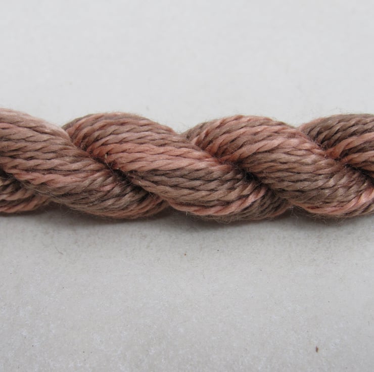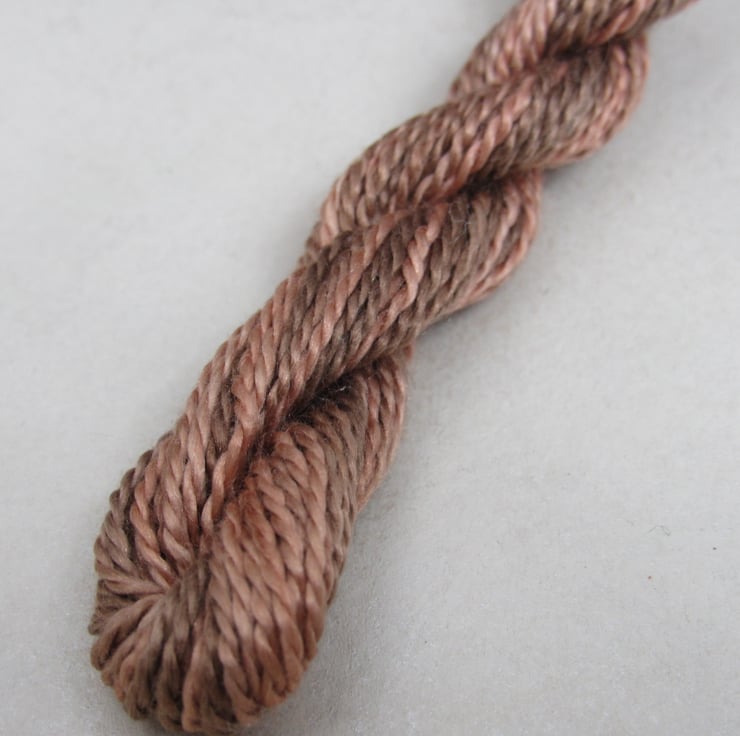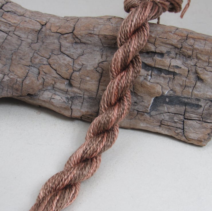 Hand dyed pure silk embroidery thread, dyed with walnut and birch to give a gentle toning brown space-dyed thread.