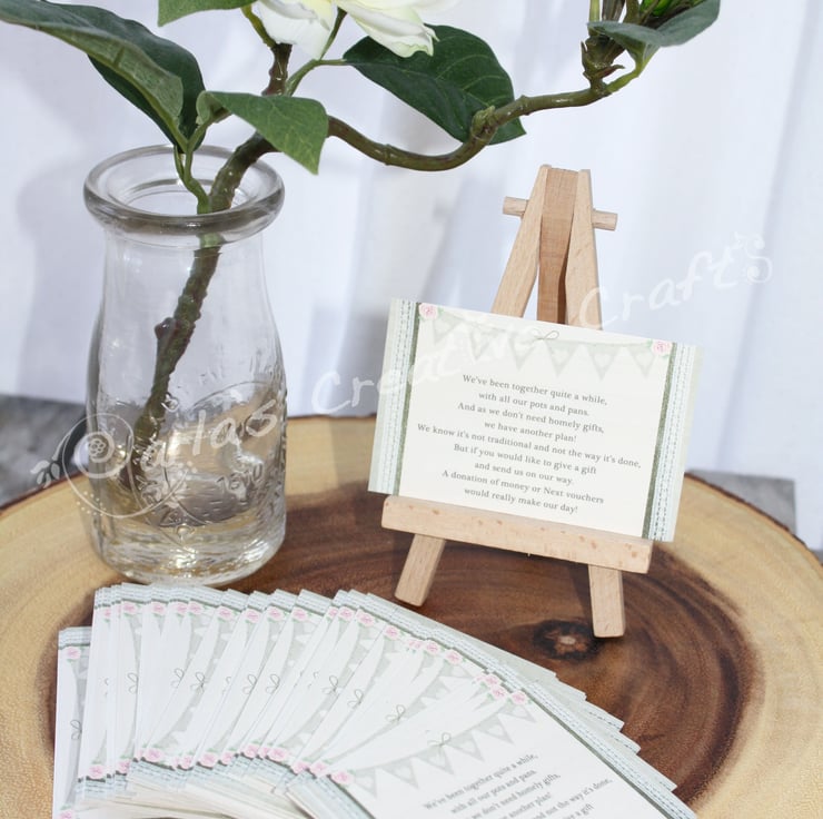 The money cards include my unique Shabby Chic bunting design with a polite donation poem. If you would like the last line changed to ‘A donation of money towards your honeymoon’ etc please let me know so I can change the wording before it goes to print.