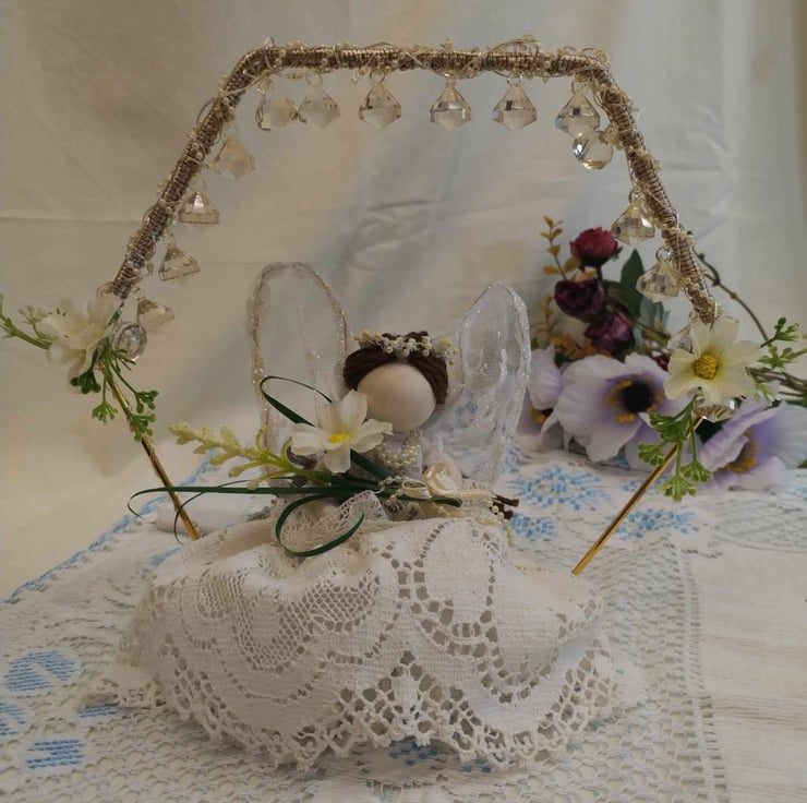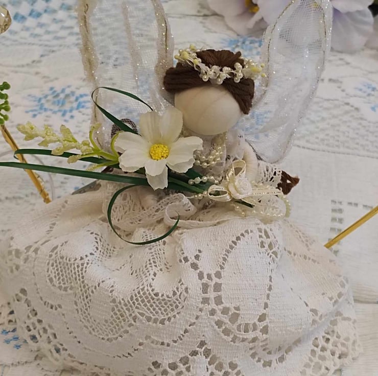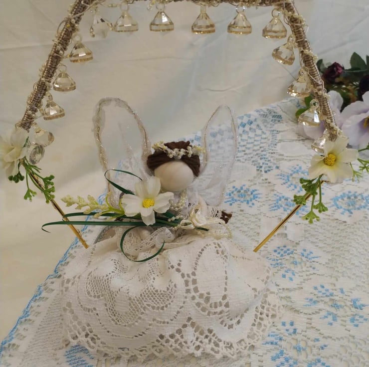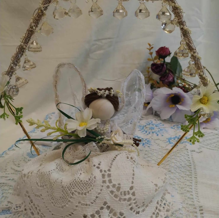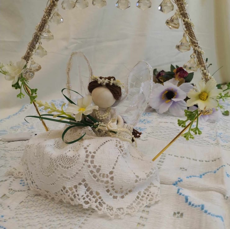 Handmade Doll with wooden head wool wrapped wire and brown wool hair. Her dress is made of white vintage cotton lace and she is holding a floral bouquet. She is sitting on a brass hoop with fairy lights and tear drop crystals.