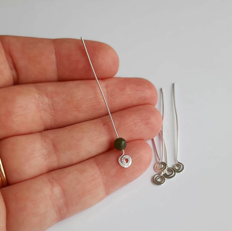The head pins are individually handcrafted using 100% recycled 925 sterling silver wire so they're eco friendly too! Each one is formed into a spiral at one end and the spiral is then hammered flat which makes it strong and sturdy.