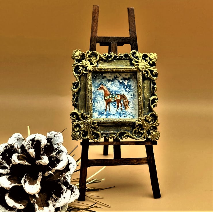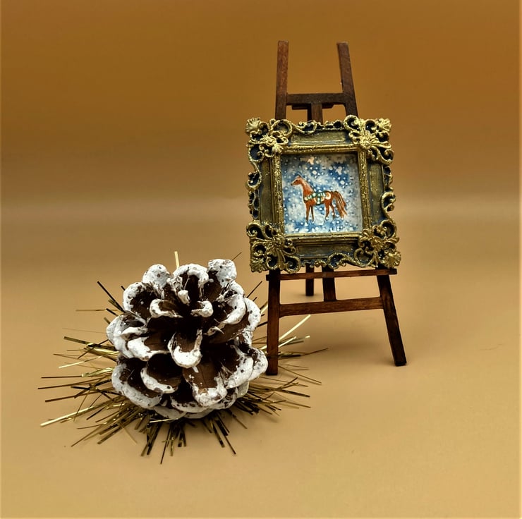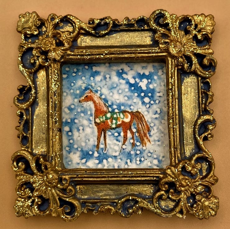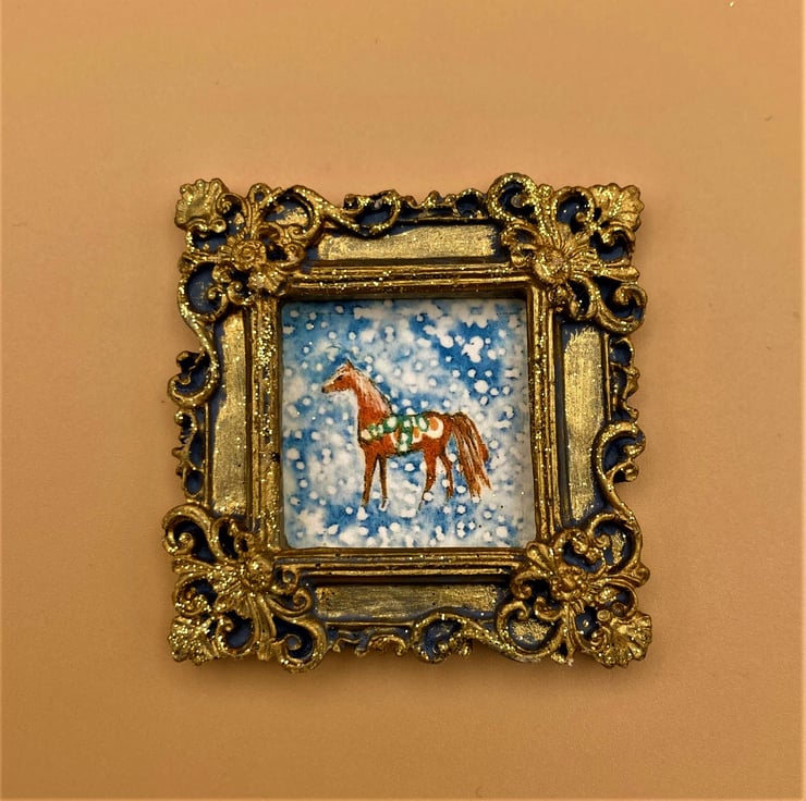 This is a tiny framed and signed PRINT of a little Swedish pony in the snow. The whole picture is about the size of a large postage stamp and is taken from my original miniature painting of the same size, This little horse would make a charming gift, older teen-ager stocking filler or decoration. the hand made OOAK plaster frame has a touch of glitter and gold acrylic paint to give it that little extra celebration sparkle.