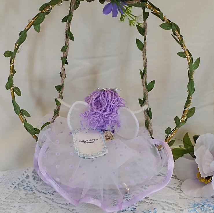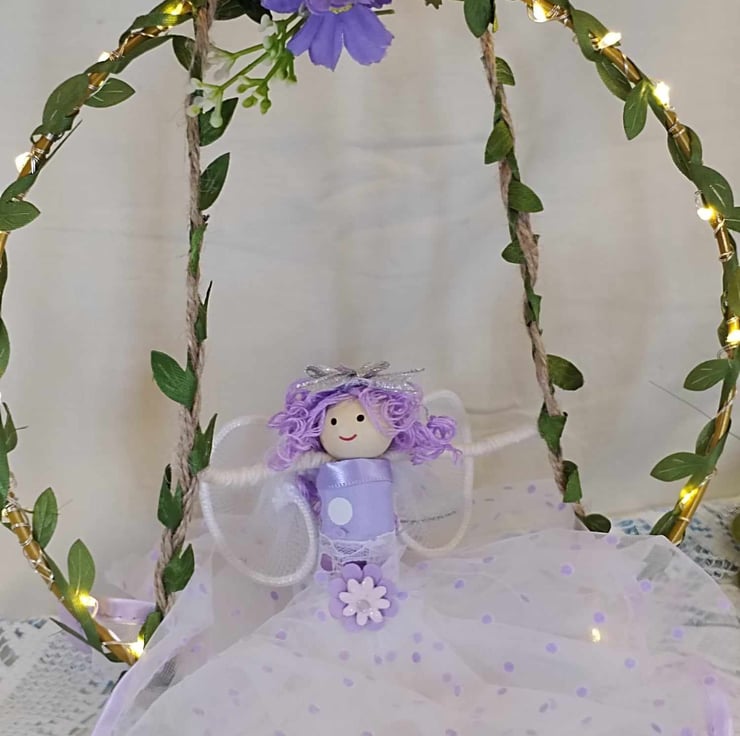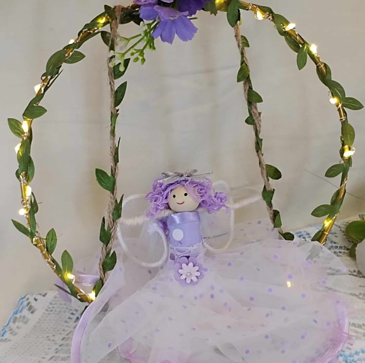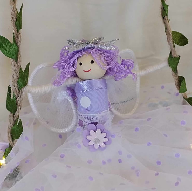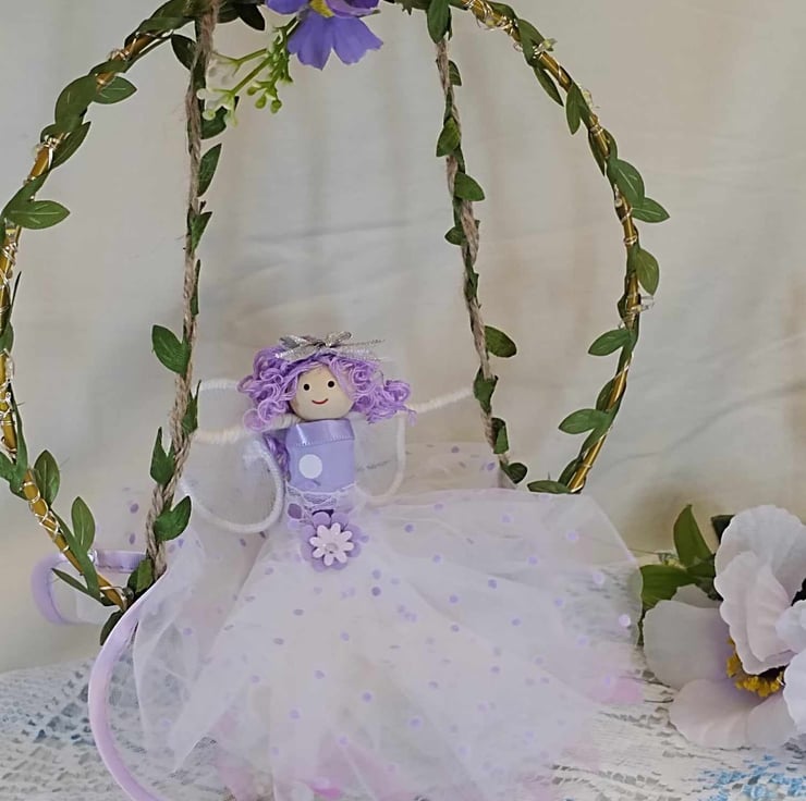 Handmade Fairy doll on her swing with a soft Lilac chiffon dress and flowing curly hair.