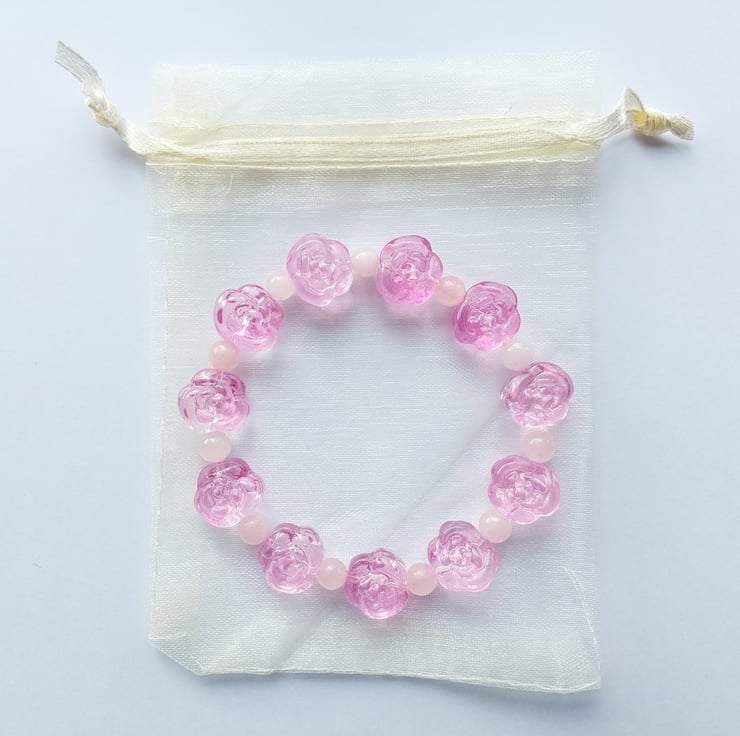 This is a beautifully feminine rose quartz and glass flower stretch bracelet in pink.