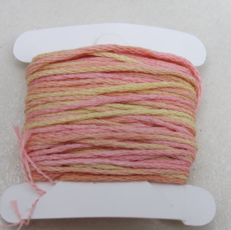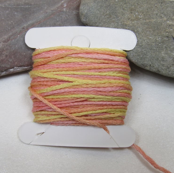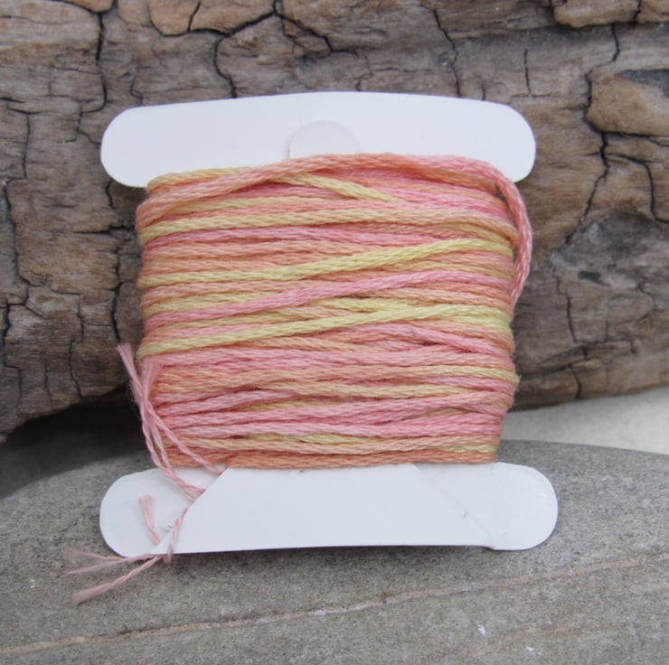 Hand dyed stranded cotton embroidery floss, dyed with weld and madder dyes to give a pretty variegated yellow / orange / pink thread