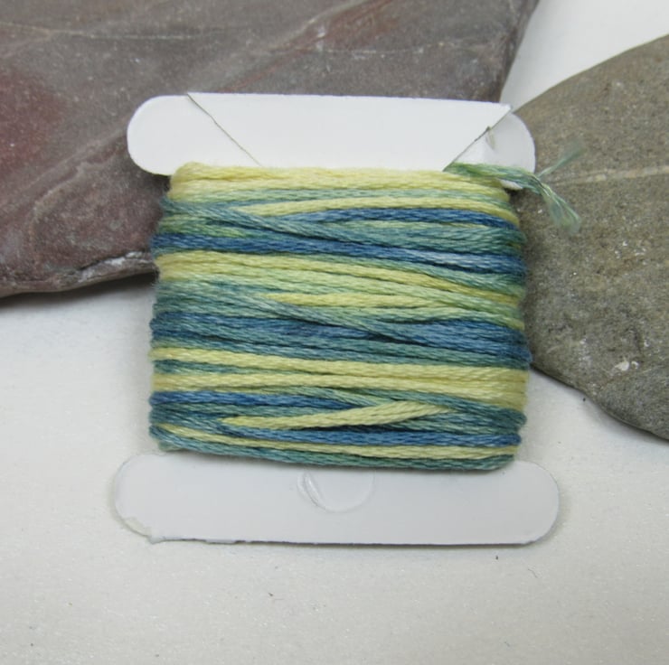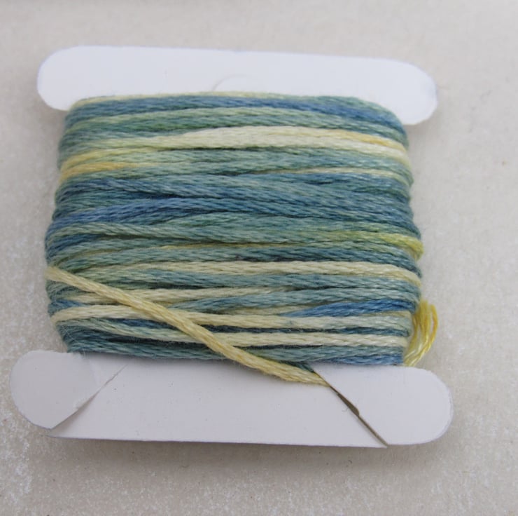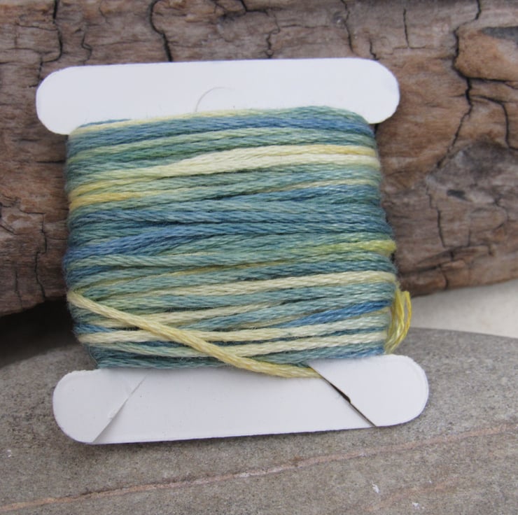 Hand dyed stranded cotton embroidery floss, dyed with weld and indigo dyes to give a pretty variegated yellow / blue / green thread