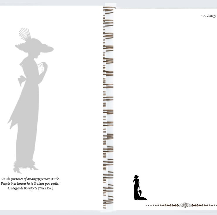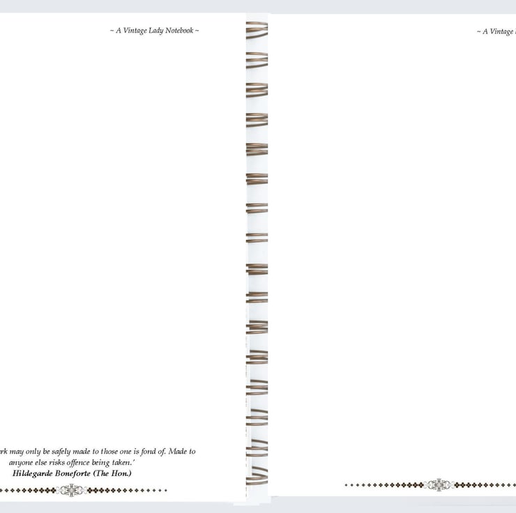 The notebook measures 5 x 8 inches and has delightful, vintage page-edge decorations and quotes from the occasionally acid pen of Hildegarde Boneforte (The Hon.), a woman who never met a strong opinion she couldn’t hold!