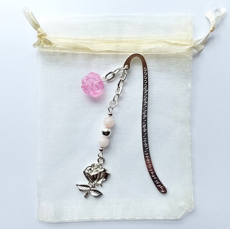 This flower metal bookmark is made with rose quartz beads 6 mm, a pink flower glass charm and a metal rose charm.
