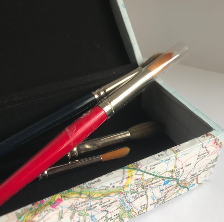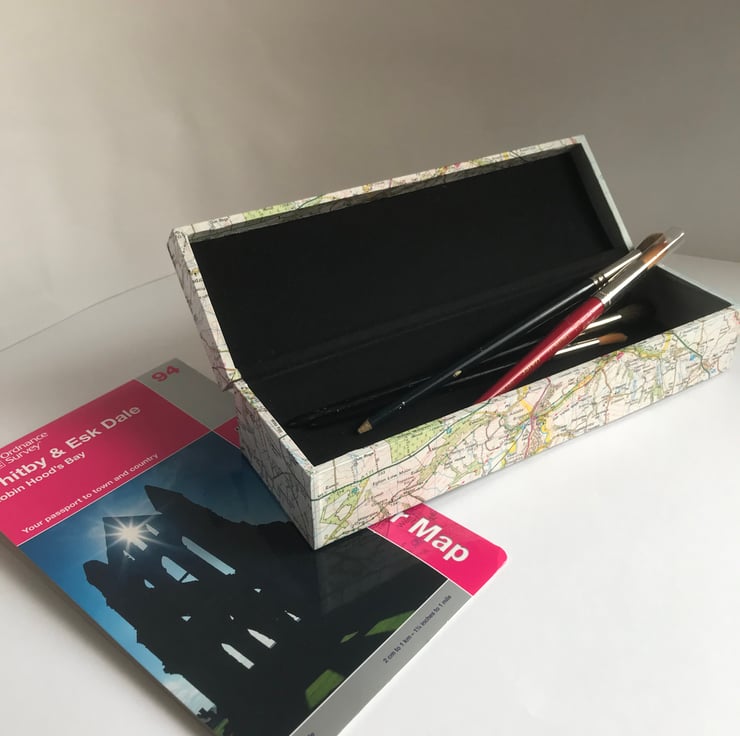 One-off pen or brush box covered in a genuine Ordnance Survey map of Whitby on the east coast of England. Lined with black book cloth and with a hidden magnetic closure.