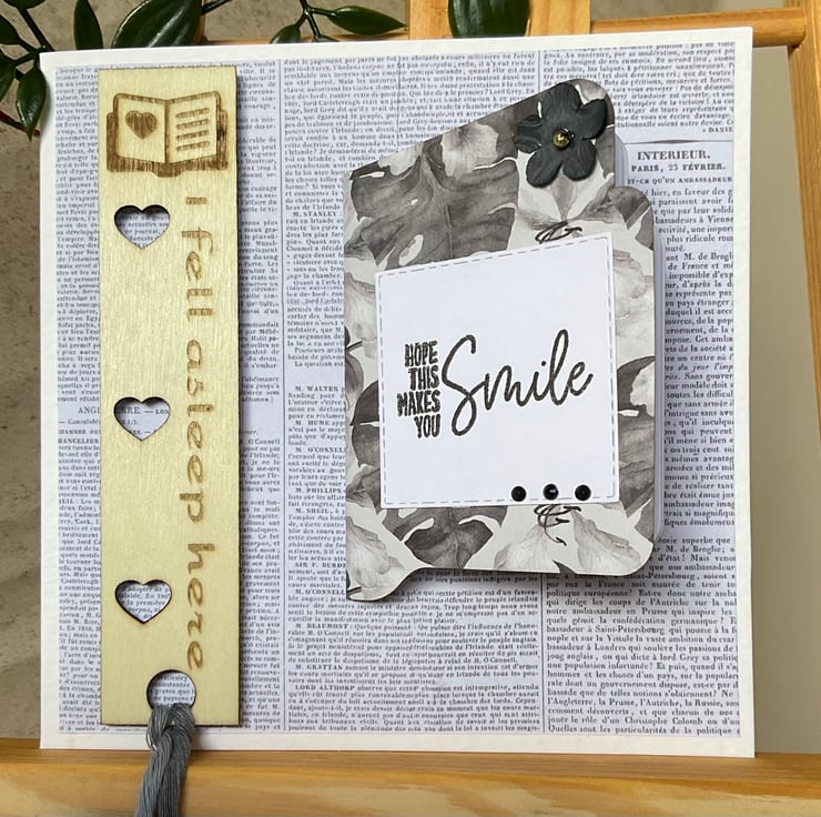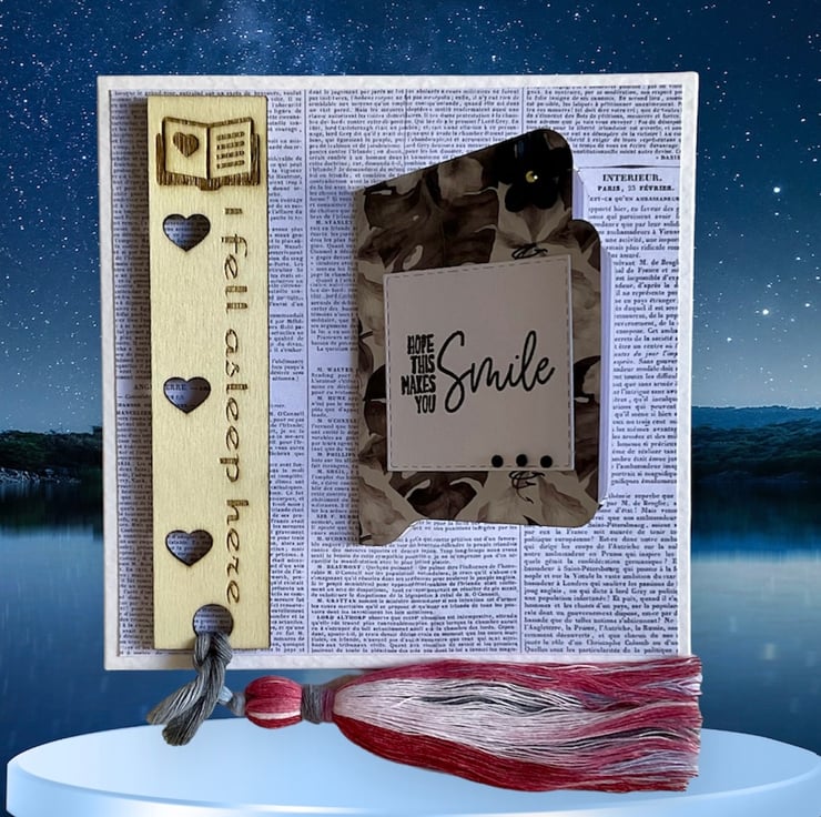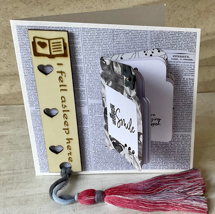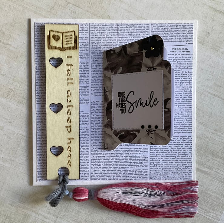 A laser cut book mark which features hearts and the words ‘I fell asleep here’ has been added to the front of the card in 3D with a grey, pink and white tassel. The wooden part of the bookmark measures 3 x 14 cms and the tassel is 17 cms. It has been applied to the card using 3D foam which is easily removed from the book mark.