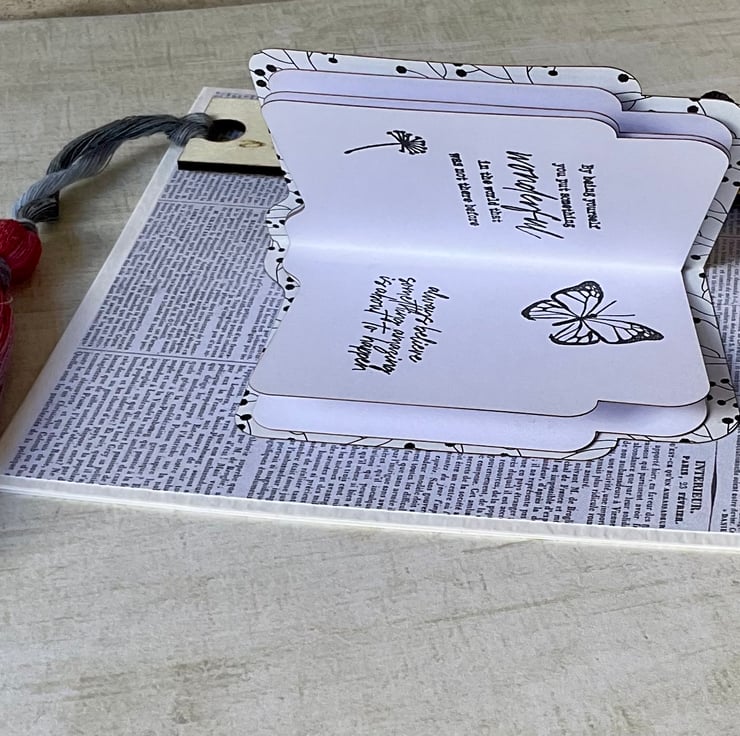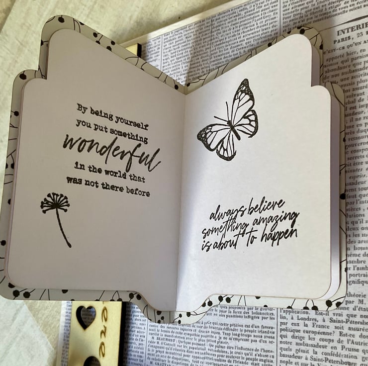 Perfect for the book lover in your life this unique card features a little book filled with six uplifting quotes. A laser cut wooden book mark has been added. This would make a lovely gift for Mother’s Day, Father’s Day or a birthday.