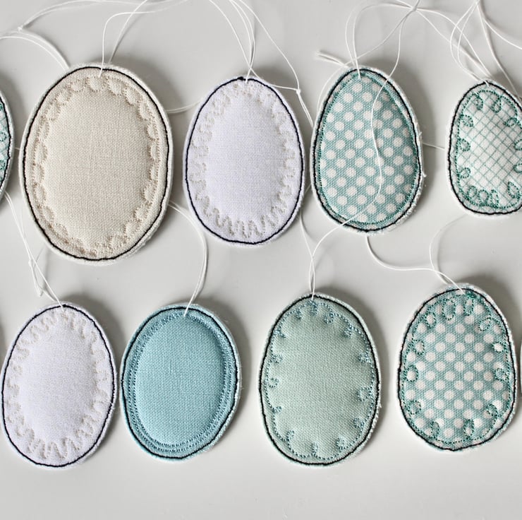 Each egg is sewn using 100% wool felt, cotton cloth and free hand machine embroidery; multiple layers of cloth are sewn together and cut out by hand using very sharp scissors. With a linen string to suspend.