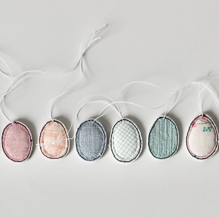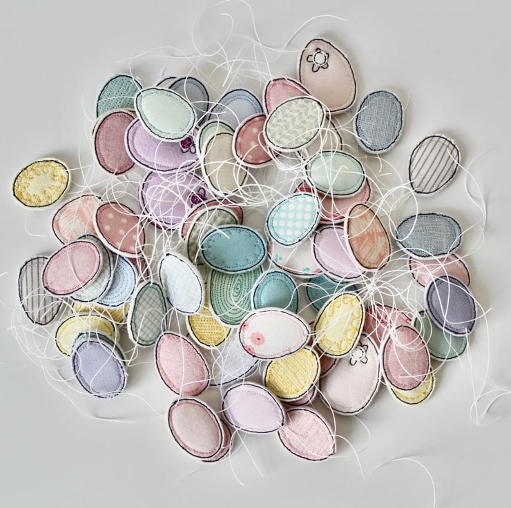 Each egg is sewn using 100% wool felt, cotton cloth and free hand machine embroidery; multiple layers of cloth are sewn together and cut out by hand using very sharp scissors. With a linen string to suspend.