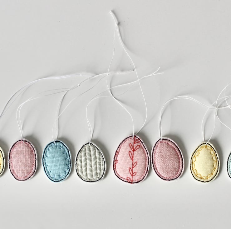 Each egg is sewn using 100% wool felt, cotton cloth and free hand machine embroidery; multiple layers of cloth are sewn together and cut out by hand using very sharp scissors. With a linen string to suspend.