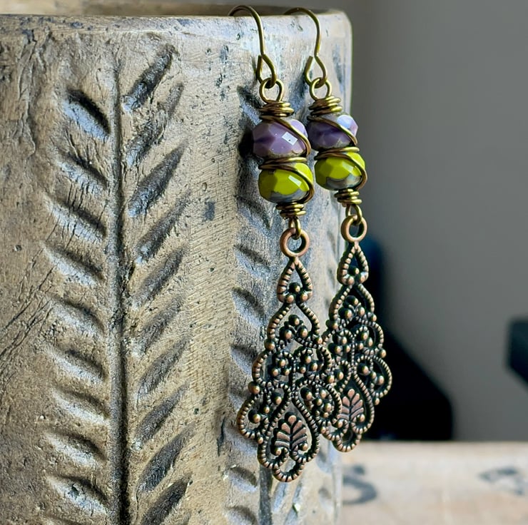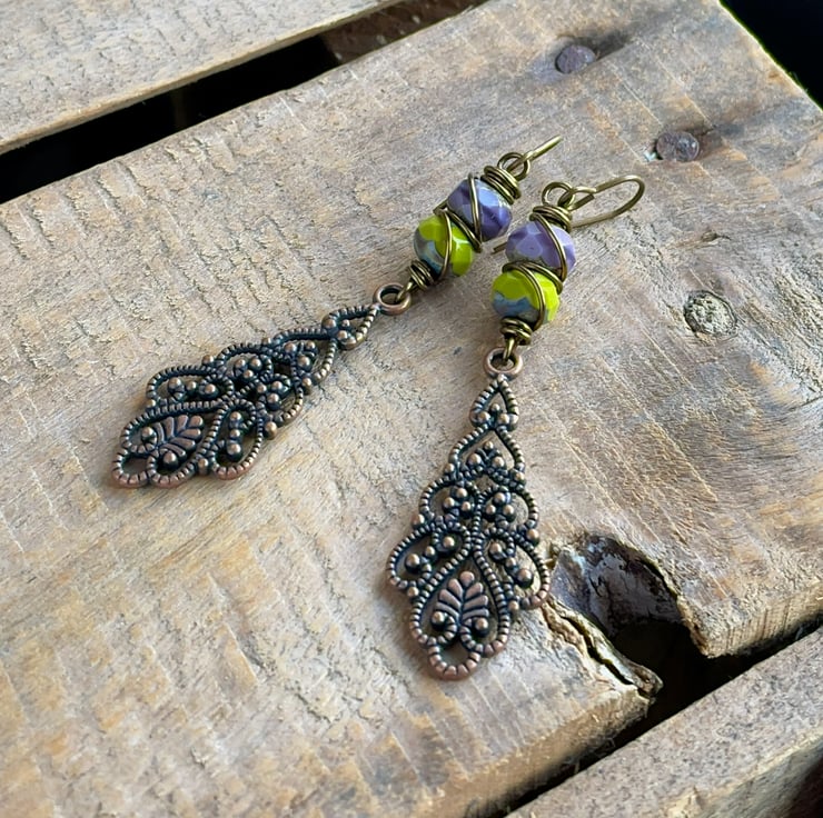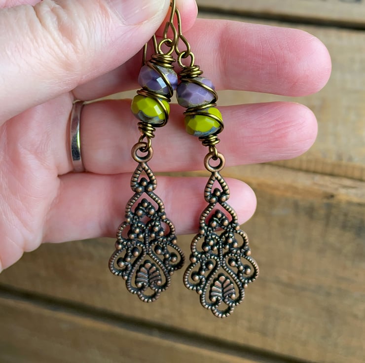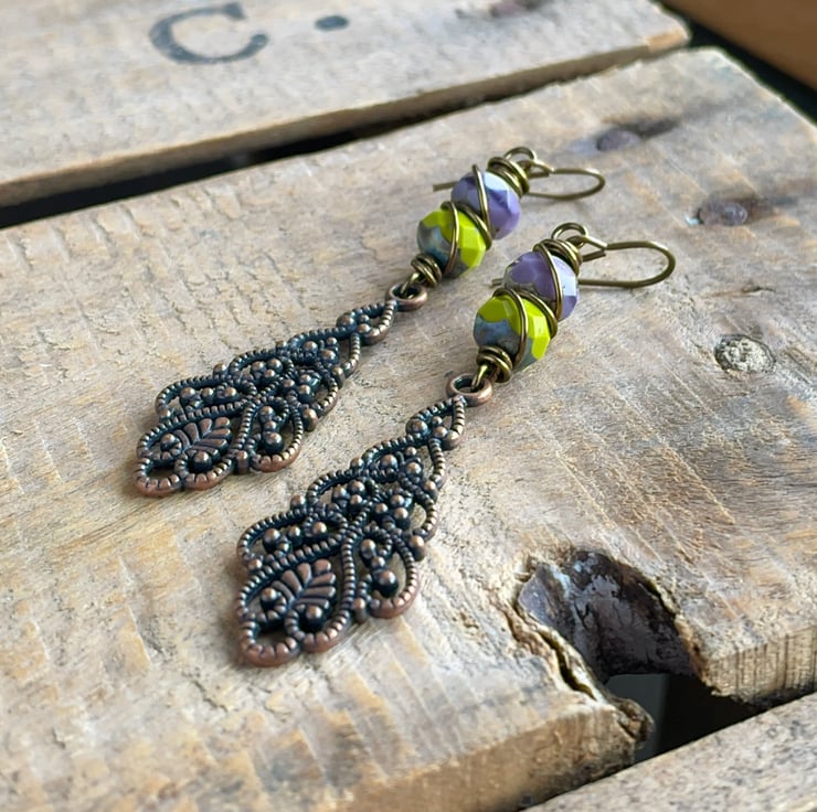 The earrings are finished with antiqued copper coloured filigree drops, which have a pretty leaf design.