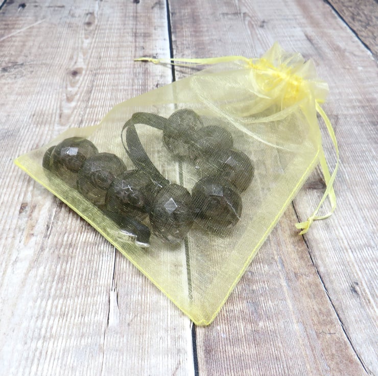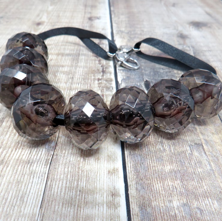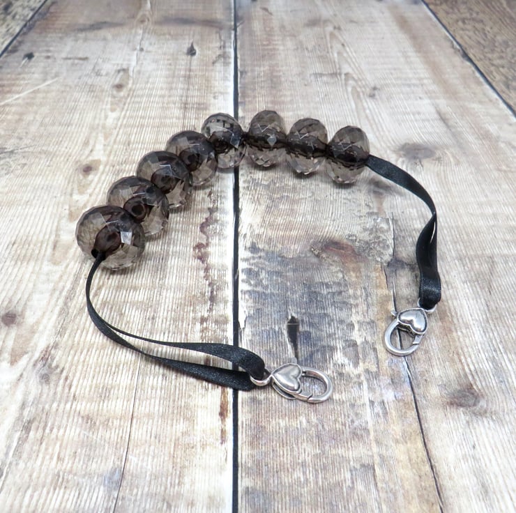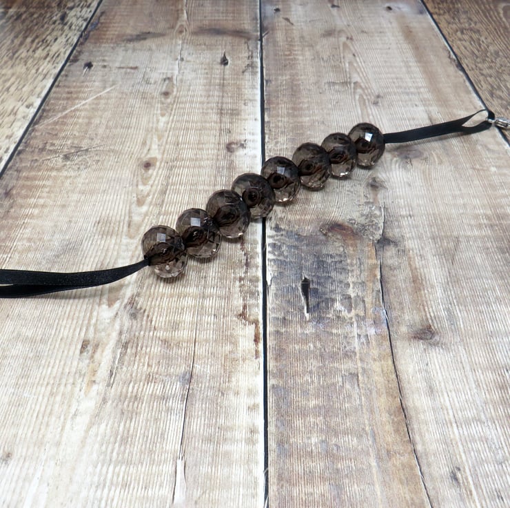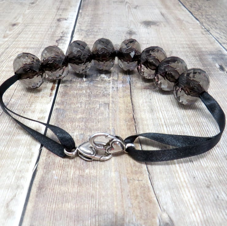 Eight large faceted acrylic beads have been threaded onto black satin ribbon to create a unique 'One of a kind' bag handle. Just clip onto the existing anchor points of your bag using the pretty heart shaped lobster claw clasps and you're good to go. The bag handle measures 40 cm in length (to the ends of the clasps), and is presented in a pretty organza bag.