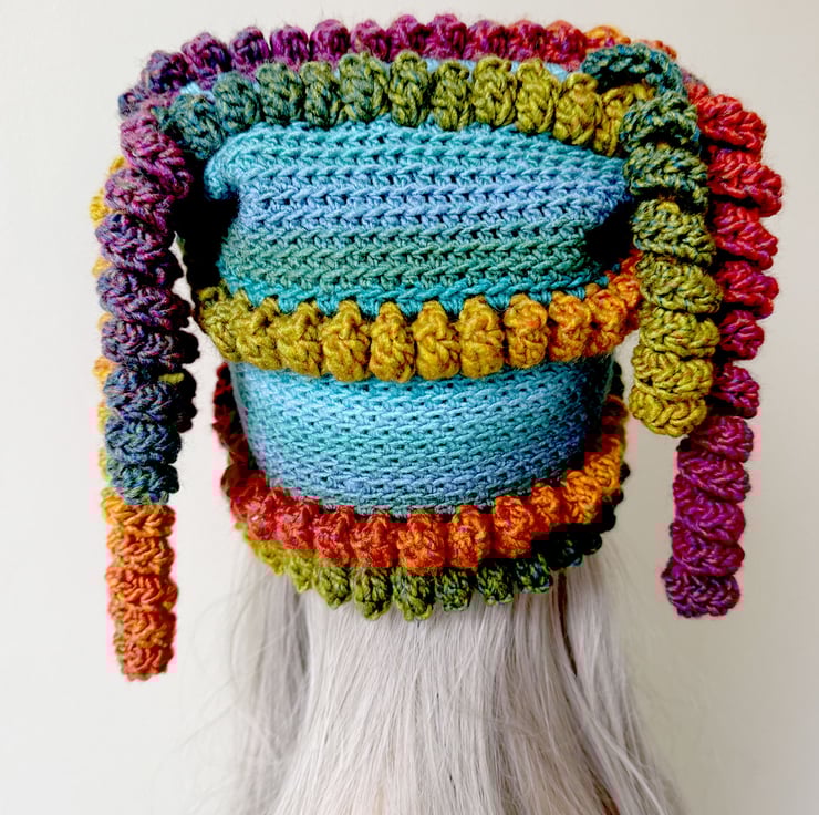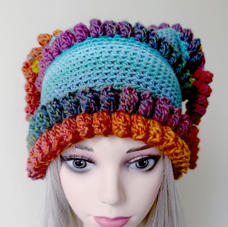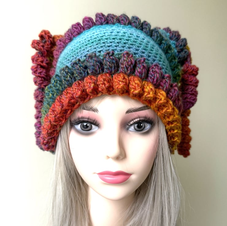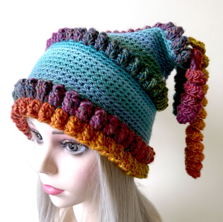 Hand crotchet funky teal and rainbow festival style hat with curly tassels. Made from vegan friendly acrylic yarn in aran and chunky weight. Washable. Slightly stretchy so will fit most size heads.