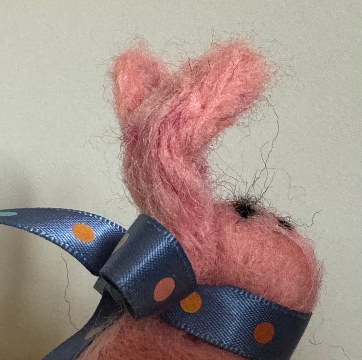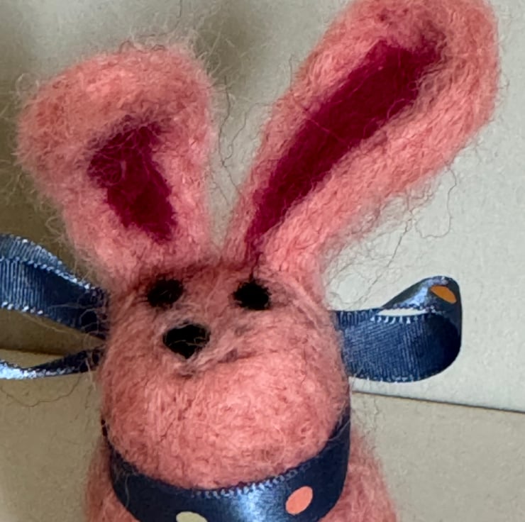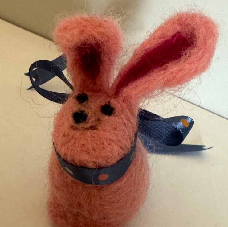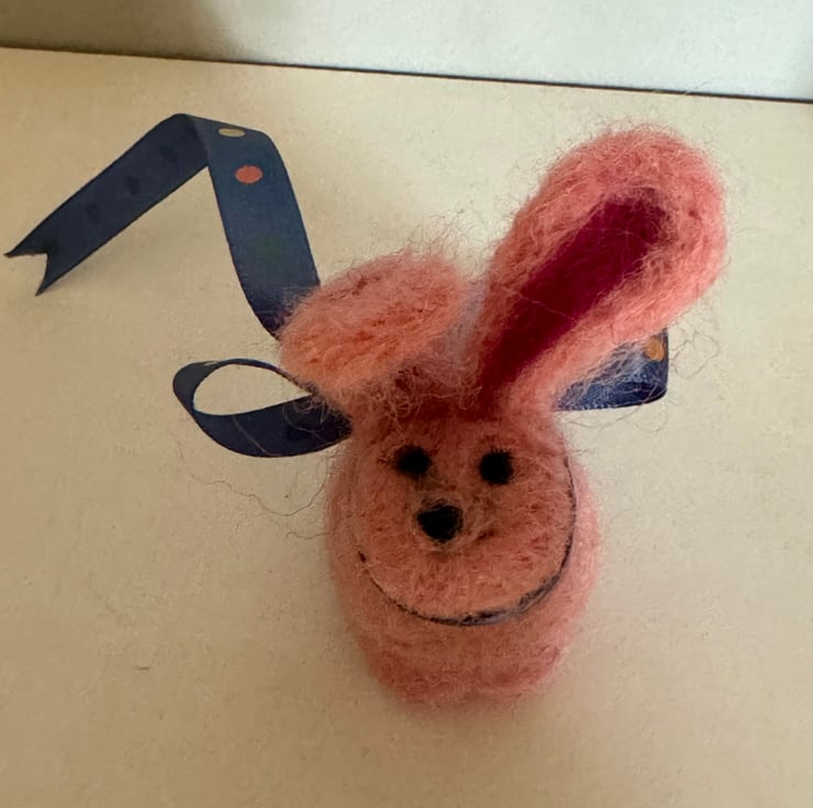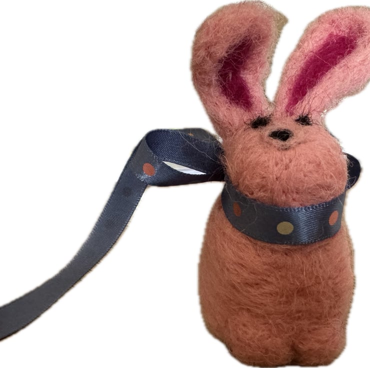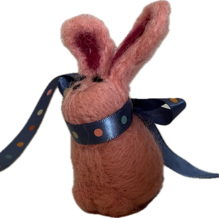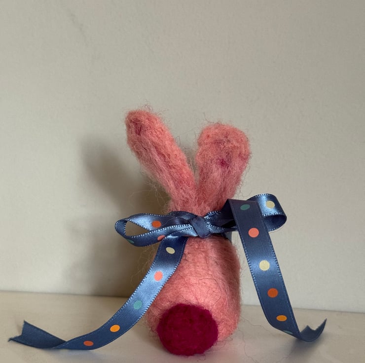 An adorable hand felted pink bunny who measures 9cm tall and 4cm wide. It has been hand made by me and wears a cute blue spotted ribbon. It will be the perfect addition to your Easter decorations for many years.