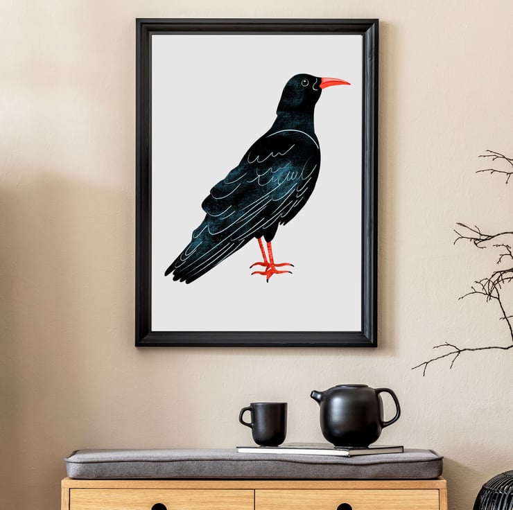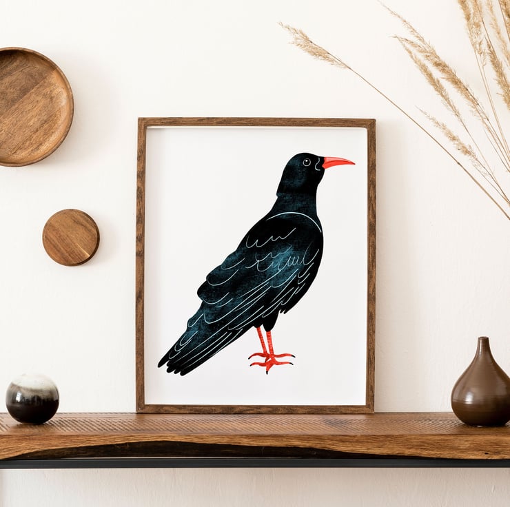 The Cornish Chough came extinct in Cornwall in 1947 but has since returned and has begun to breed again. I have been so lucky to have had a pair of choughs land in my cottage garden by the sea and I loved creating this fun illustration.
