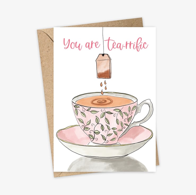 You are Tea-rrific' A6 greeting card featuring a hand drawn tea cup illustration. Perfect card for Mum, Gran, Nan, Auntie who loves a good cuppa in a bone china cup. This lovely tea cup was inspired by the tea cups my gran used to have. She always drank Earl Grey tea which is now my favourite cuppa too!