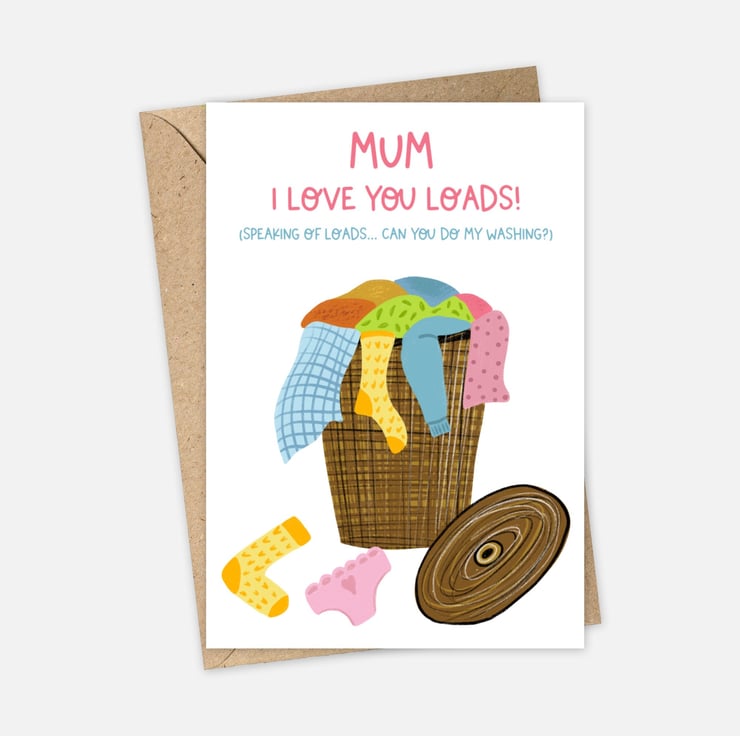 Mum, I love you loads! (speaking of loads... can you do my washing)' A6 funny greeting card featuring a hand drawn washing basket illustration. Perfect card for Mother's Day, Birthdays or just to let mum know you care!