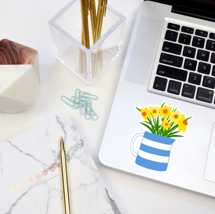 Pretty daffodils in a blue and white Cornishware jug glossy sticker, perfect for a Cornishware fan.