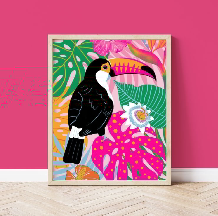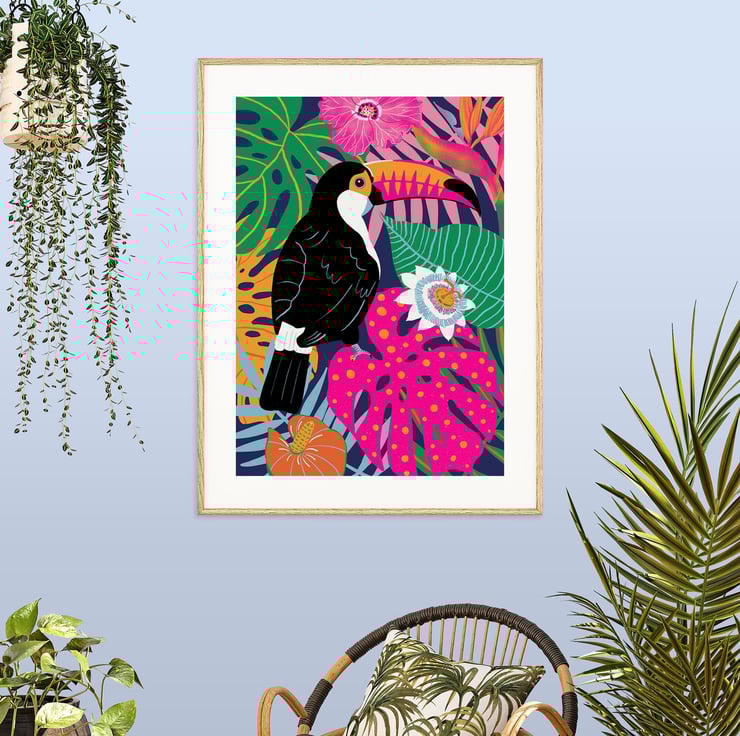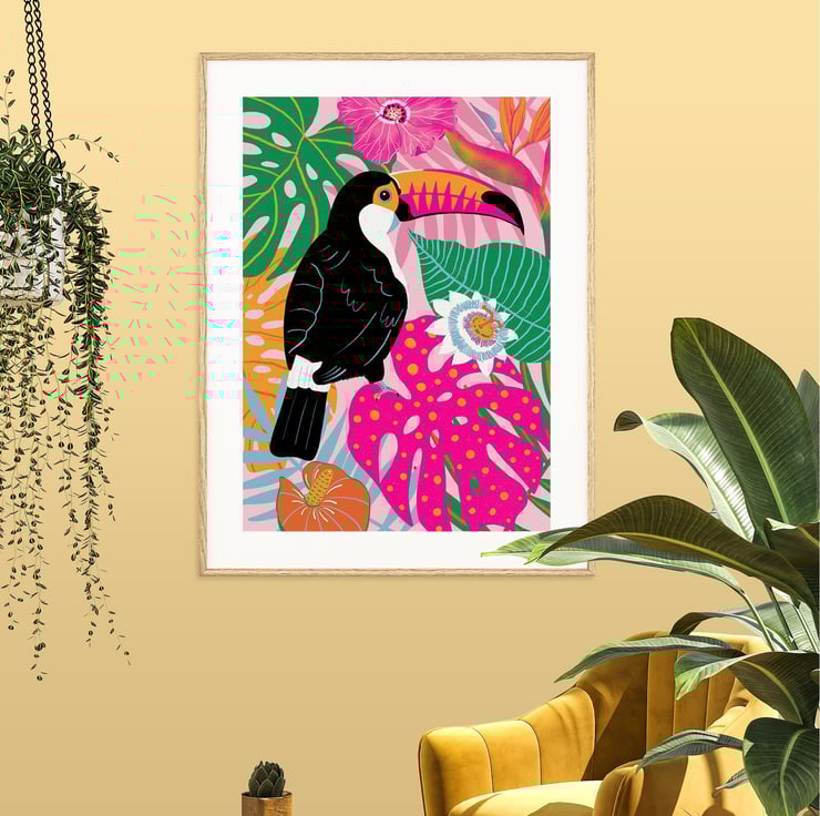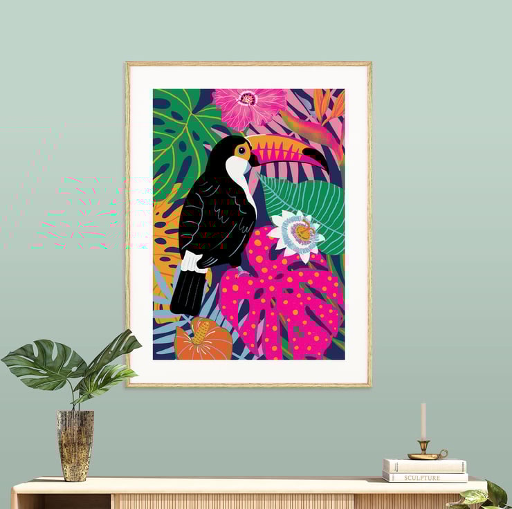 Botanical Toucan Home Decor Art Print. A hand drawn illustration of a Toucan surrounded by colourful tropical flowers and leaves. A great high quality print to add a splash of colour to your home or office.