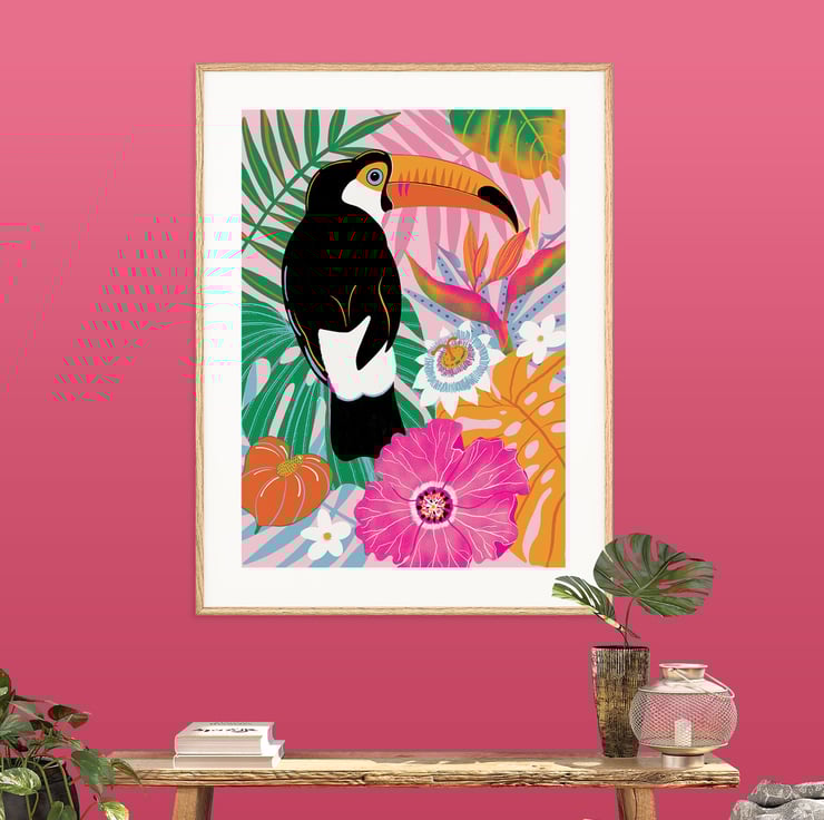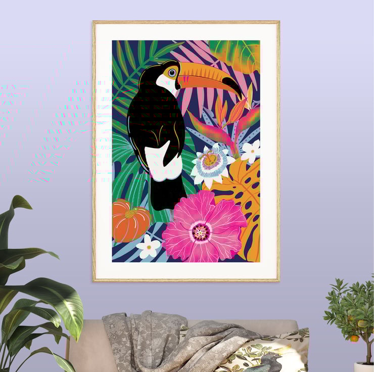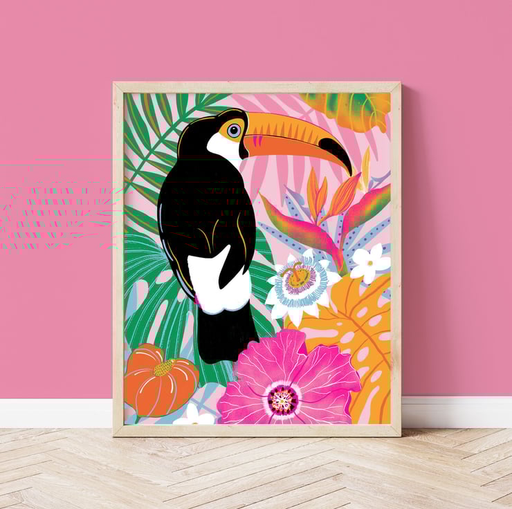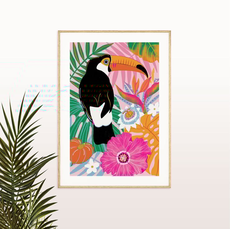 Exotic Toucan Art Print. A hand drawn illustration of a Toucan with colourful tropical leaves and flowers. A great high quality print to add a splash of colour to your home or office.