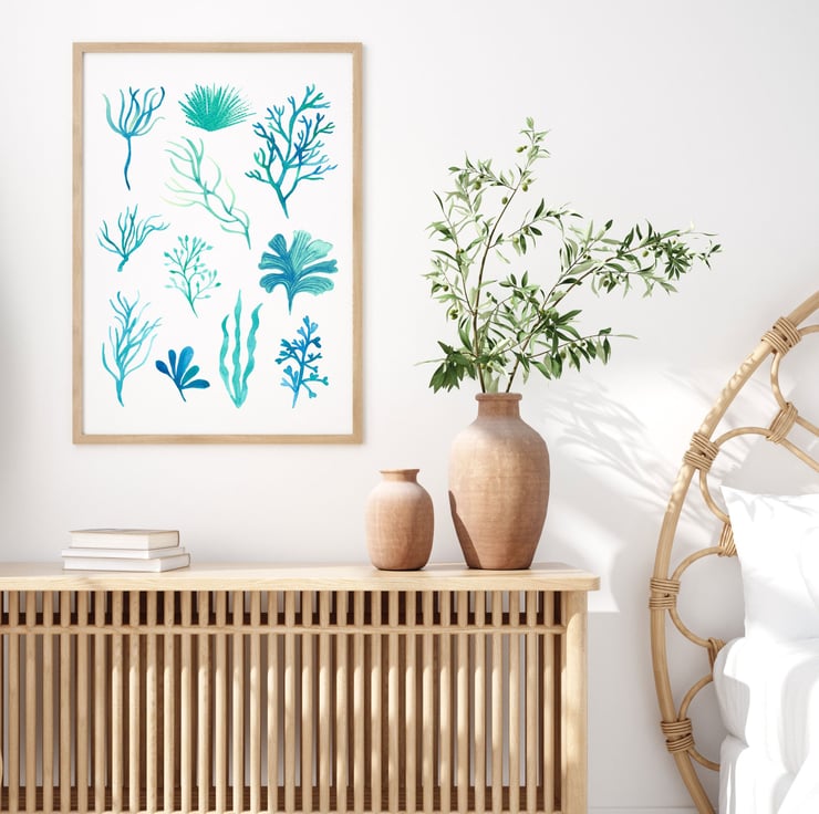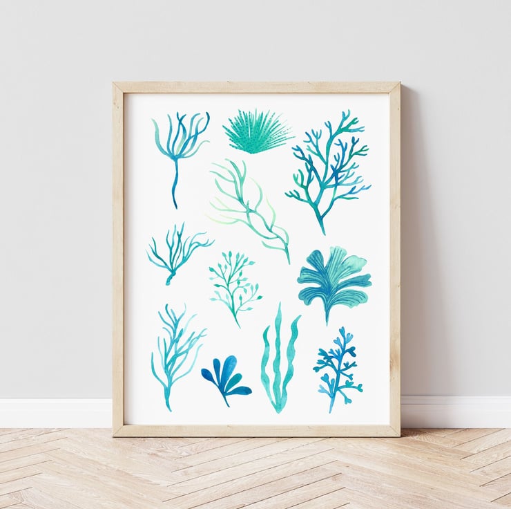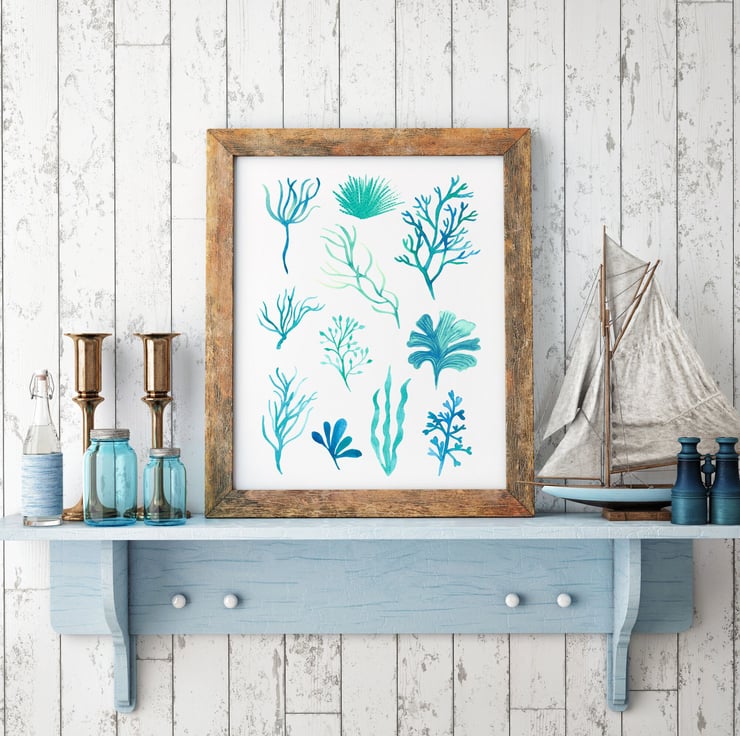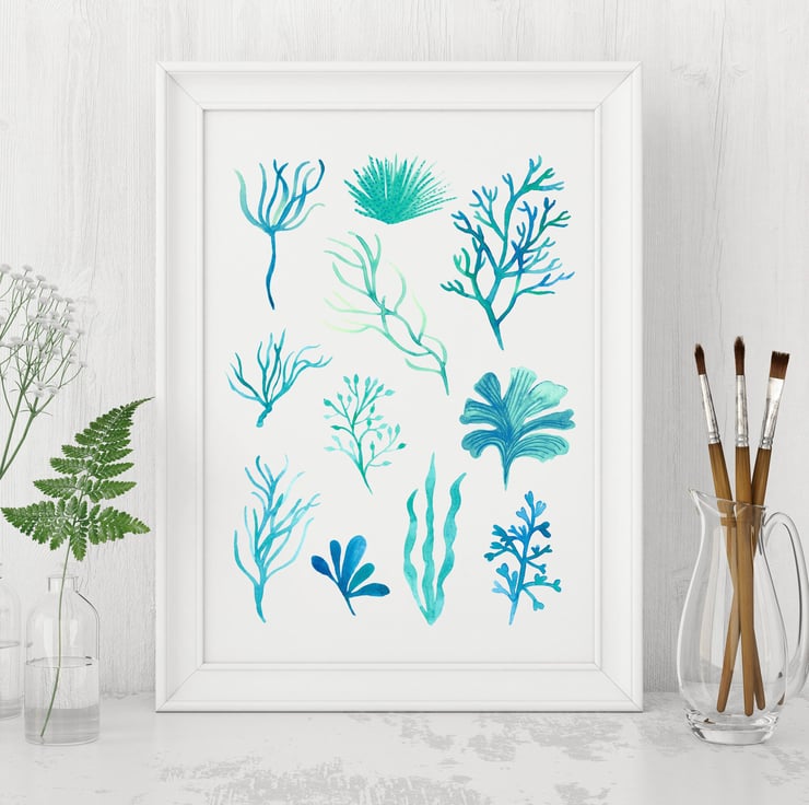 This lovely seaweed home decor art print is of my original watercolour illustration of various types of seaweed in shades of turquoise and blue.
