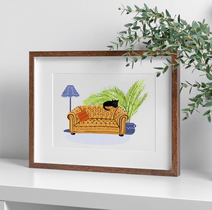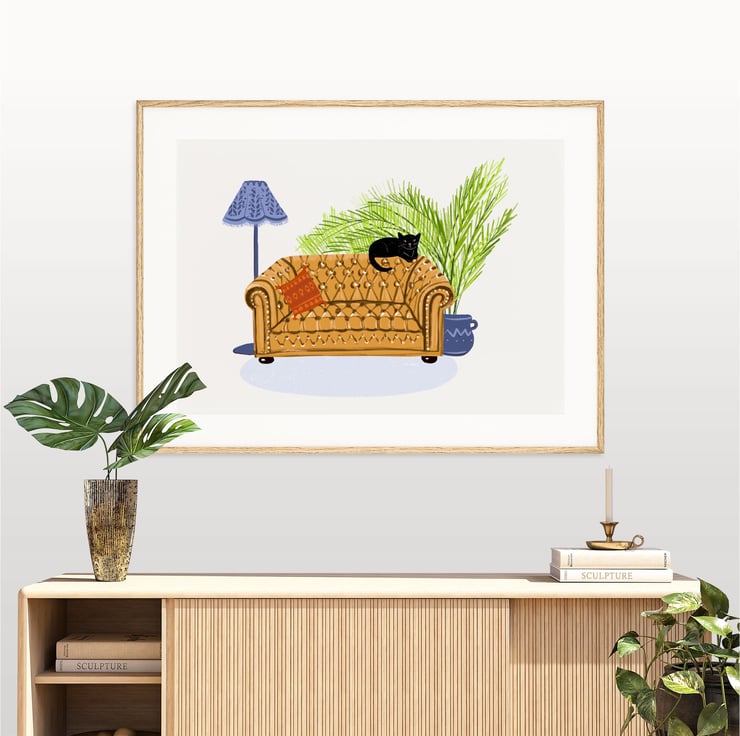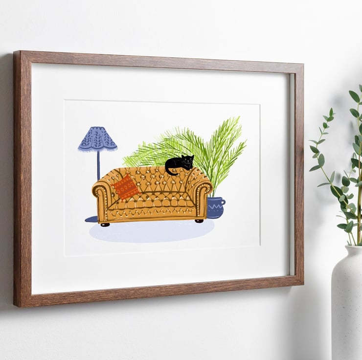 A lovely home decor print from my original illustration of a vintage Chesterfield sofa complete with plant, lamp and resident black cat.