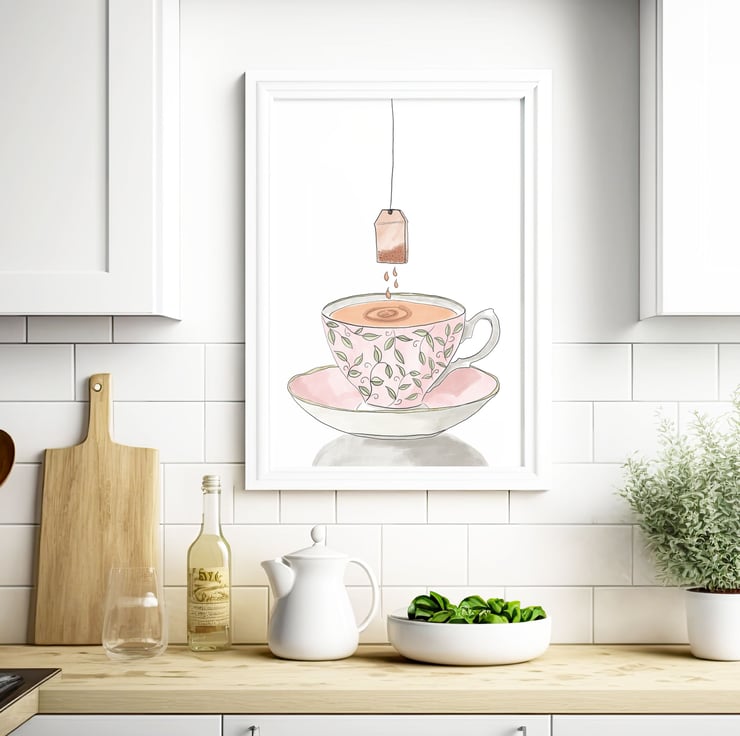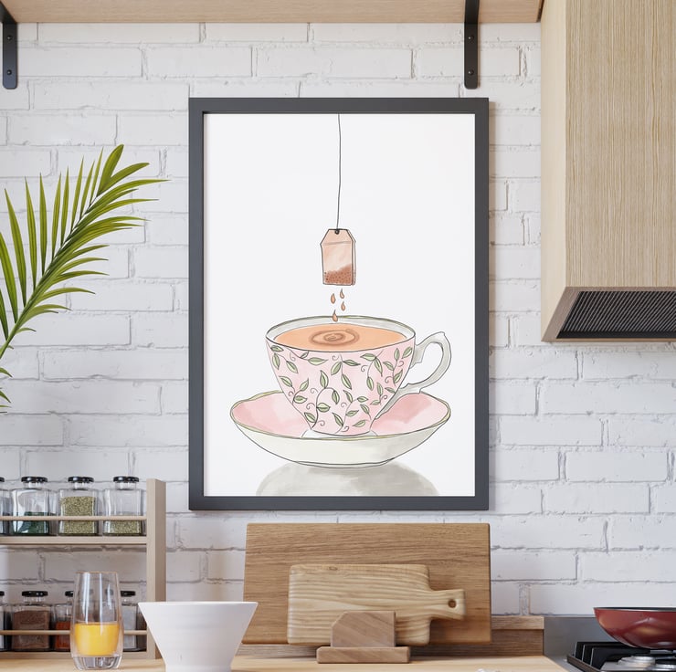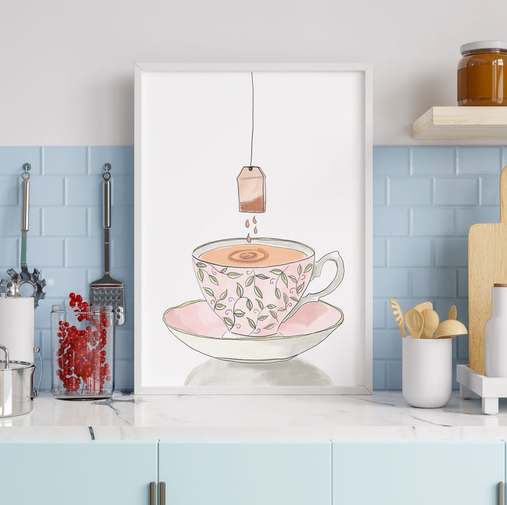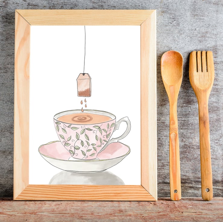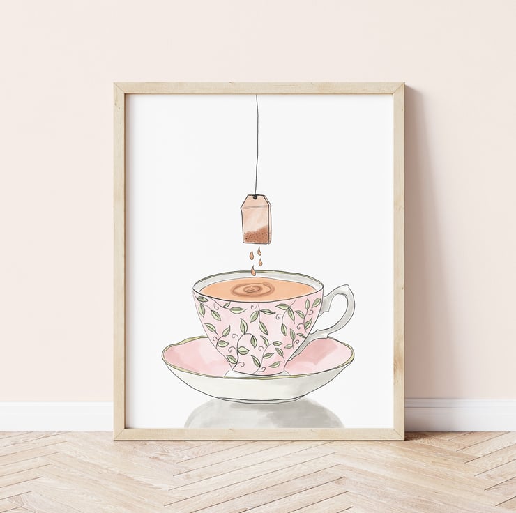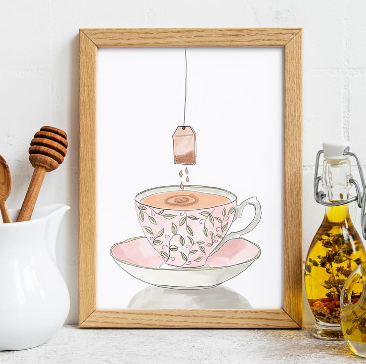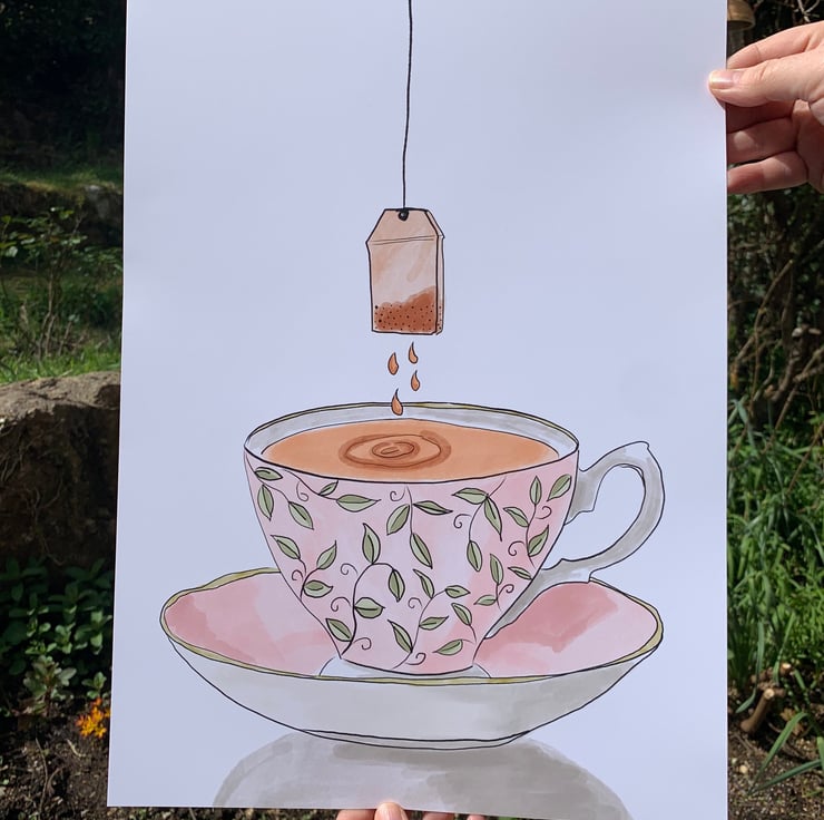 My gran always loved to have her Earl Grey tea in a fancy cup and my original illustration of a pink bone china tea cup with a teabag is inspired by that memory.