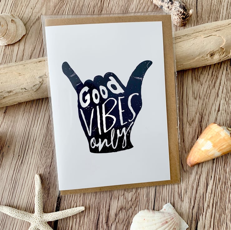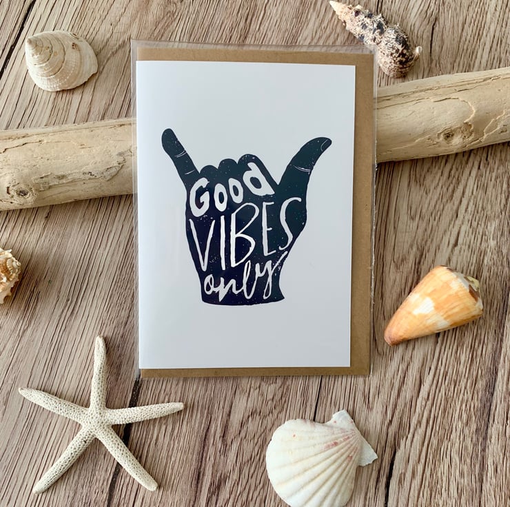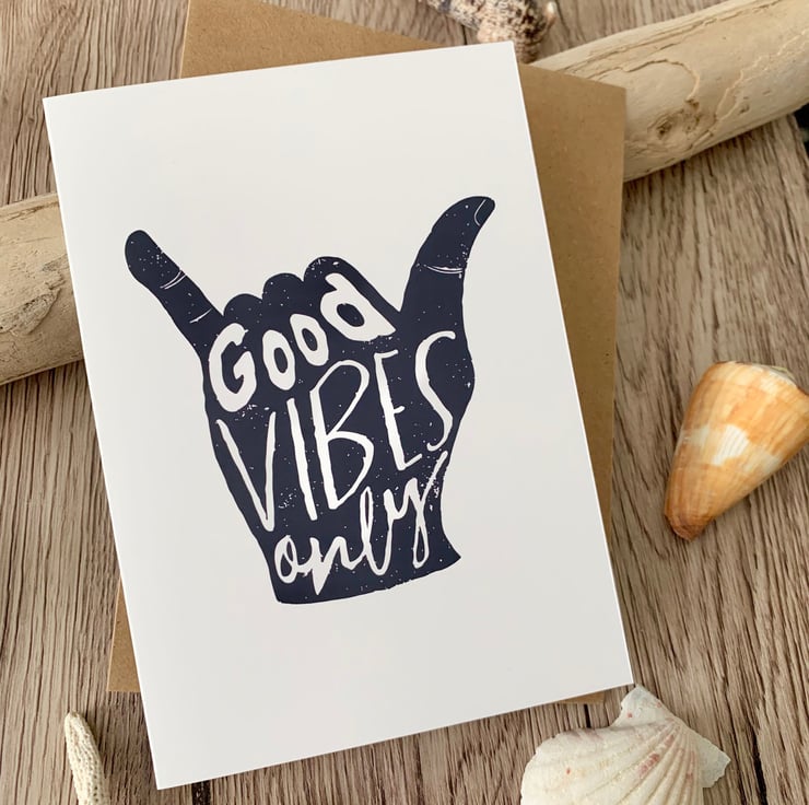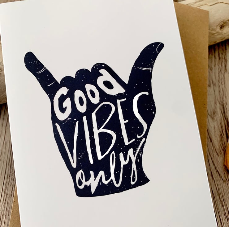 Send some Good Vibes Only with my Shaka surf art greeting card.