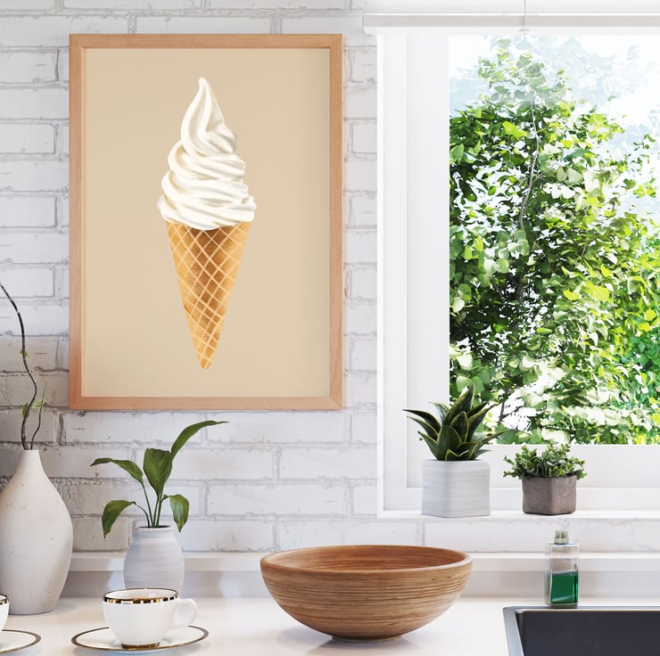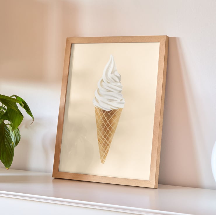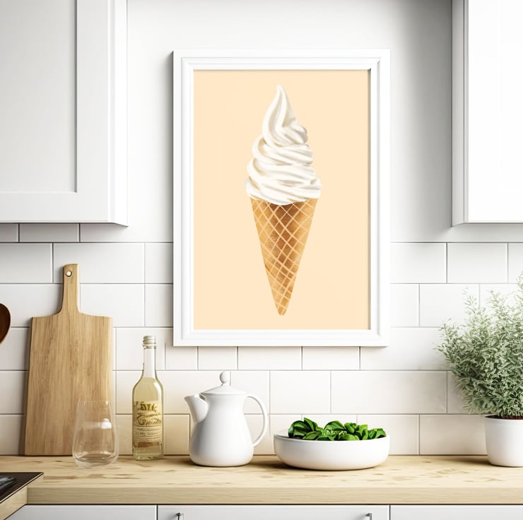 A lovely print of my original digital illustration of an ice cream cone on a light peach background.