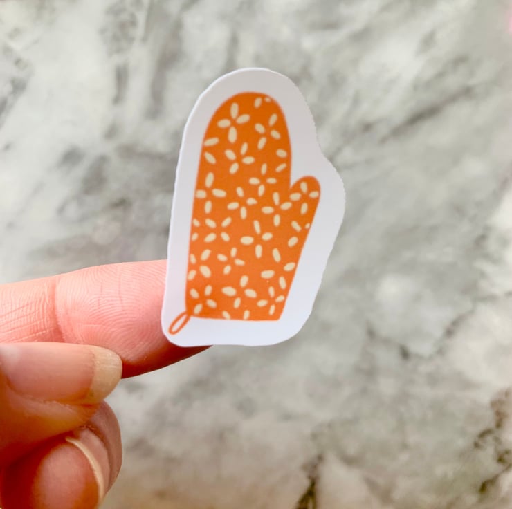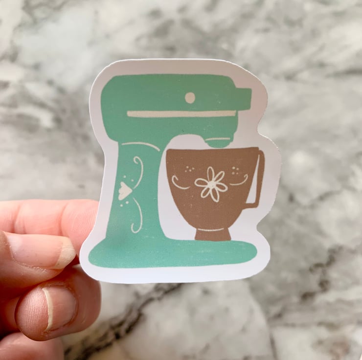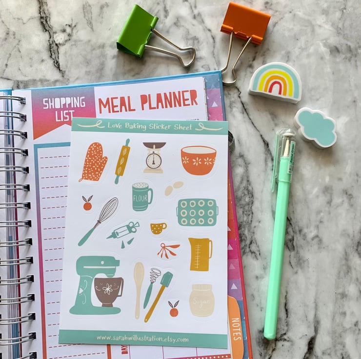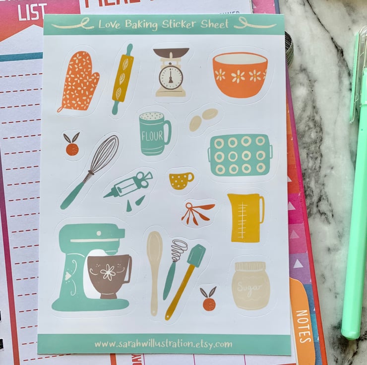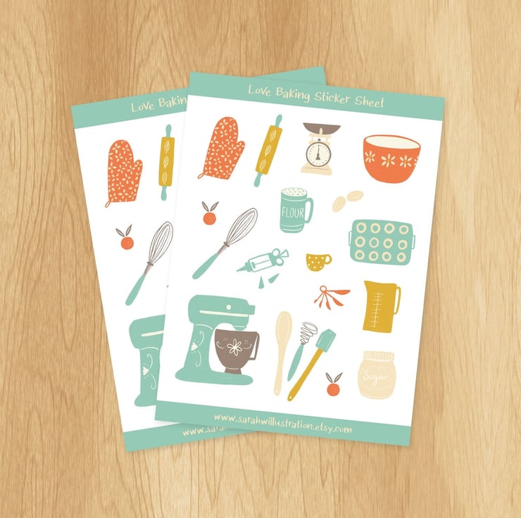 Baking sticker sheet featuring 17 illustrated vintage style baking stickers including a mixing bowl, oven glove, mixer, rolling pin, whisk, scales, jug, etc.