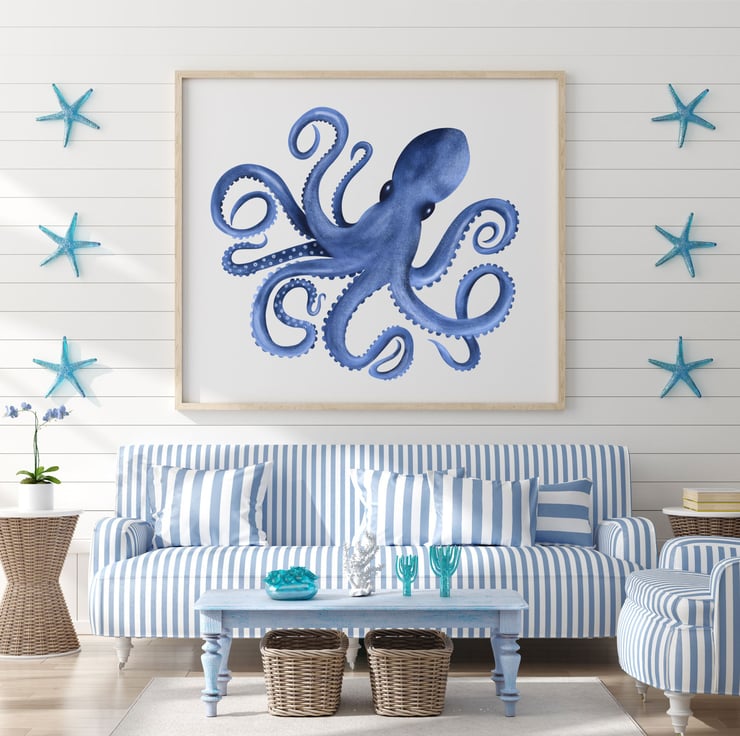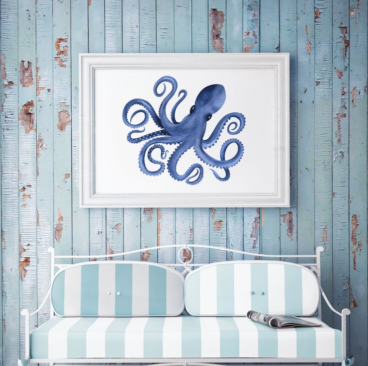 Living by the sea the ocean and sea life are an inspiration for my artwork and I love to draw sea creatures. This listing is for a wall art print of my original illustration of a blue octopus.