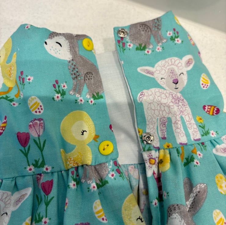 The dress is closed at the back with dolly size buttons and snap fasteners. Suitable for children 3years and over. Small parts.