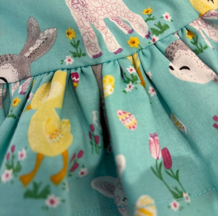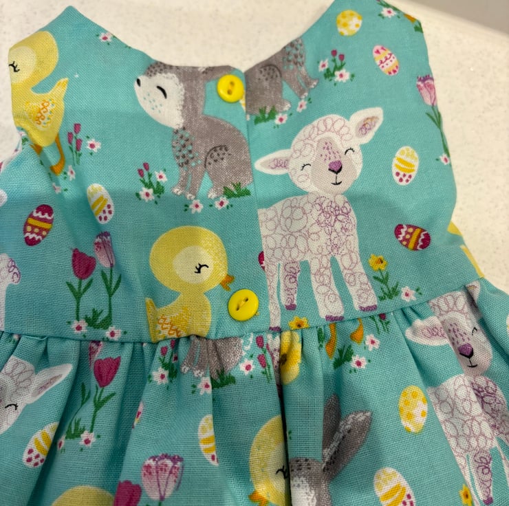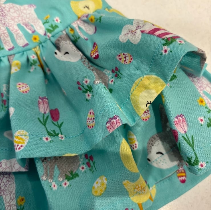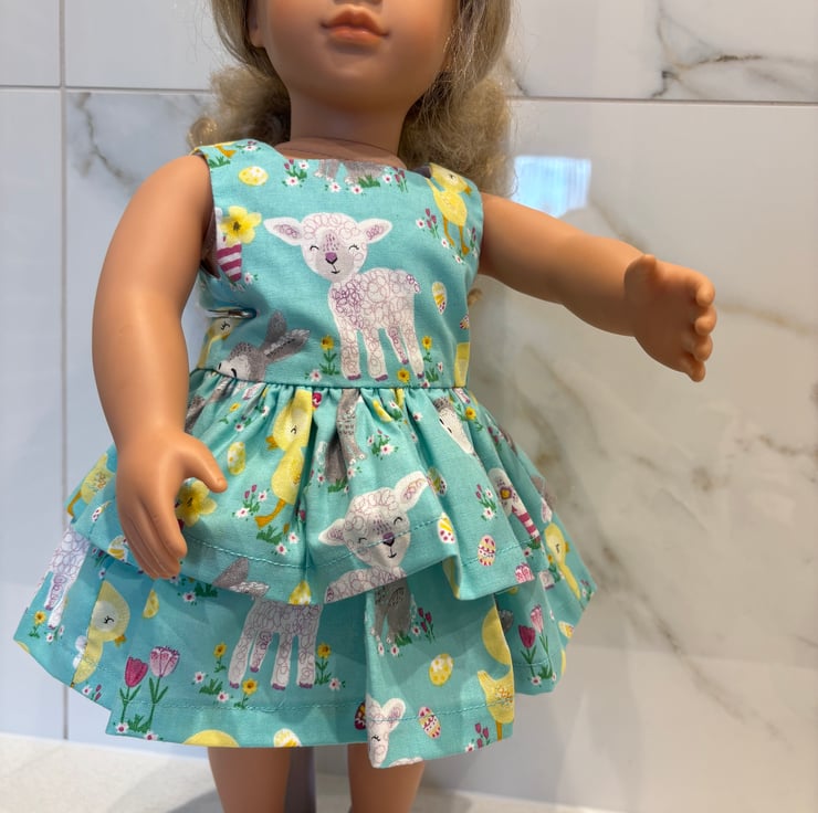 Easter/ Spring themed dress. The turquoise/green dress has two ruffles. It is made to fit 18”/46cm dolls. Fits Our Generation dolls perfectly.