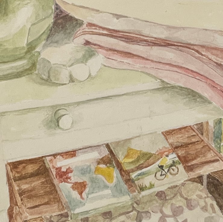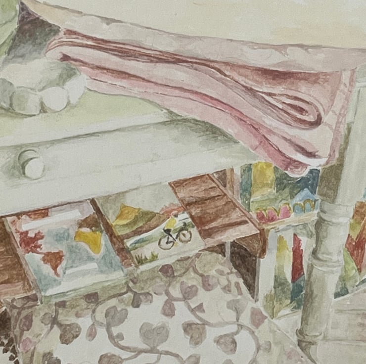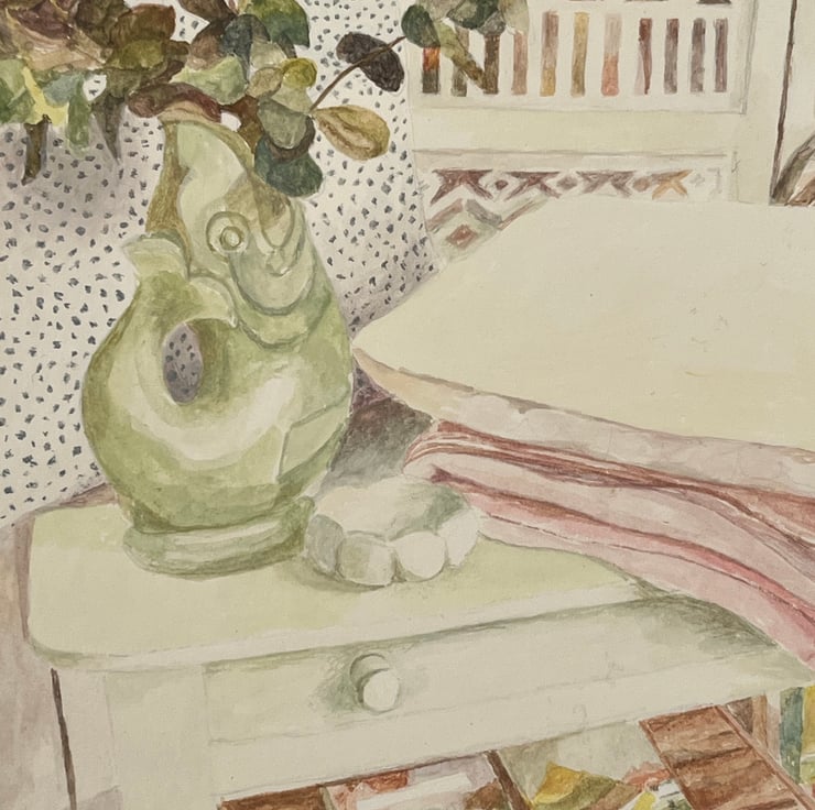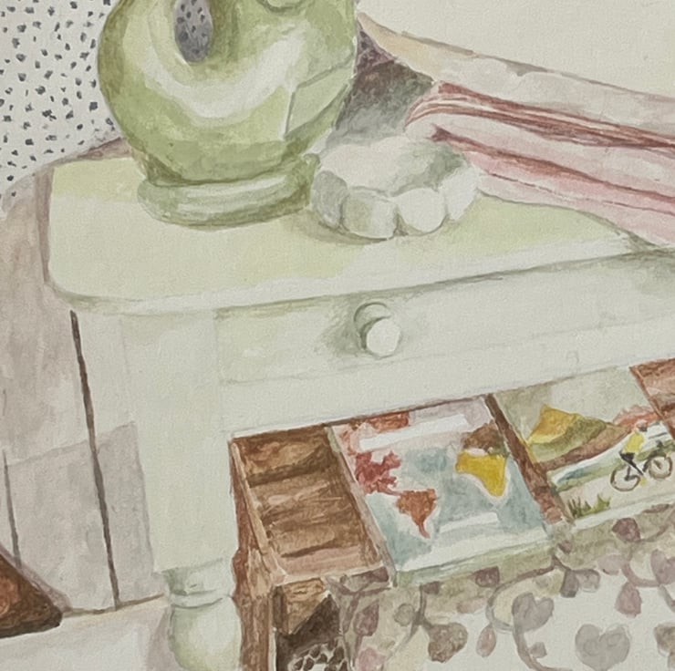 An original gouache painting of an interior scene. Gouache paints were used on 300gsm cold pressed acid free watercolour paper. The paper measures 19cm by 26cm and the image measures approximately 13cm by 16cm. An original painting that would make a special gift for someone. The painting will be sent inside a board back envelope.