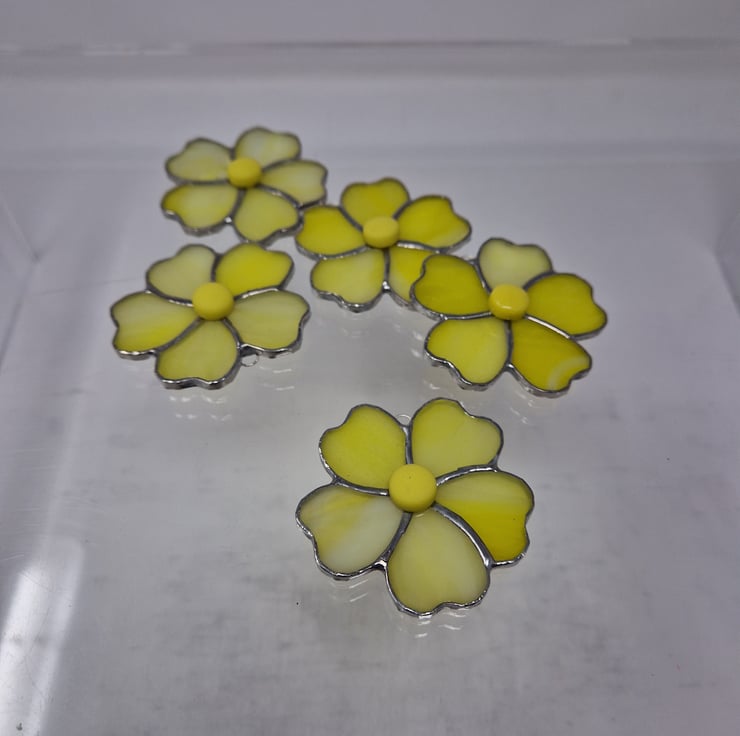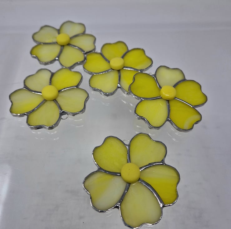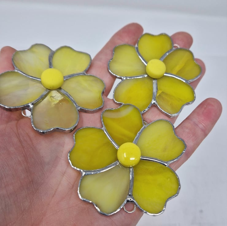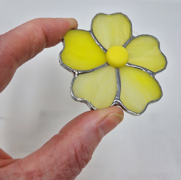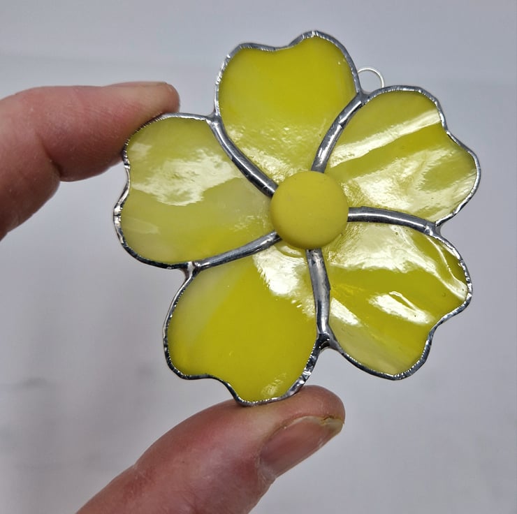 This gorgeous little flower has five petals cut from graded yellow glass. It is translucent and is a lovely cheery shiny yellow.