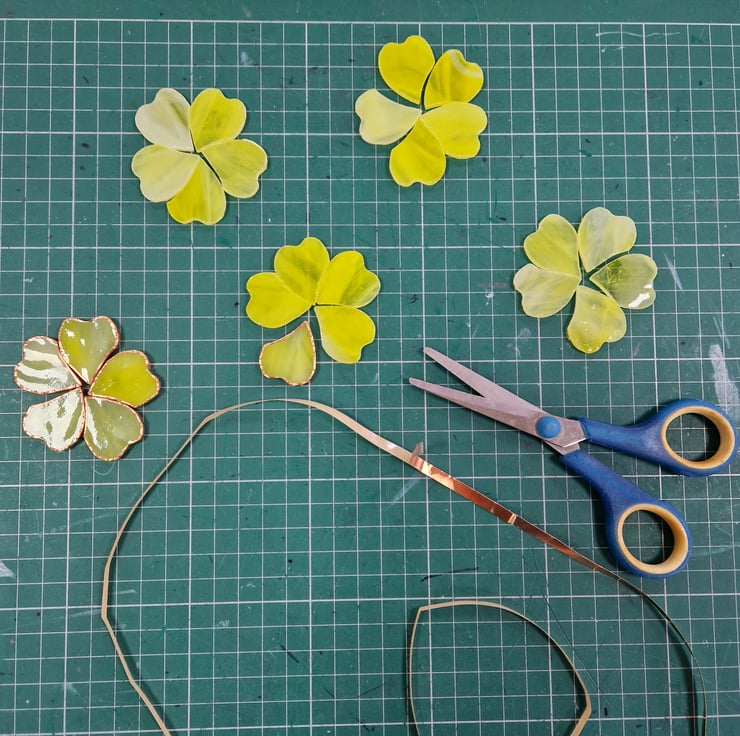 Once cut and ground, each piece is copper foiled, soldered and polished. A jump ring has been fixed for easy hanging.