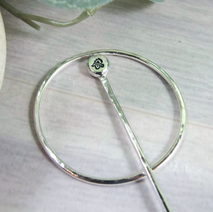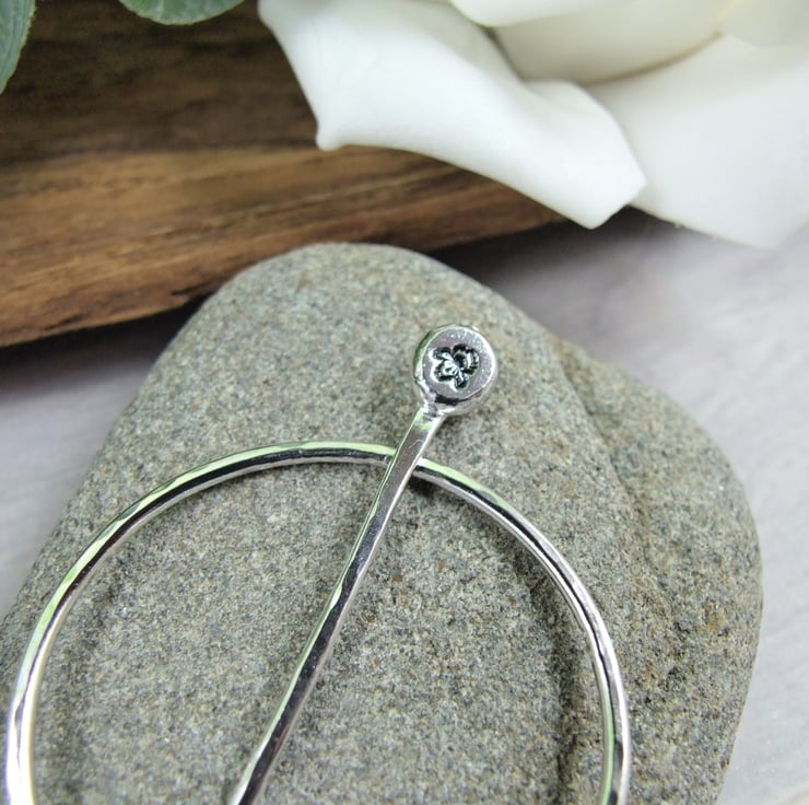 I have made the ring from 2mm solid Sterling Silver wire with hammered texture. The pin is made from 2mm wire, shaped with a rounded blunt point and at the other I have added a small silver pebble created from molten silver slightly flattened and stamped with a violet.