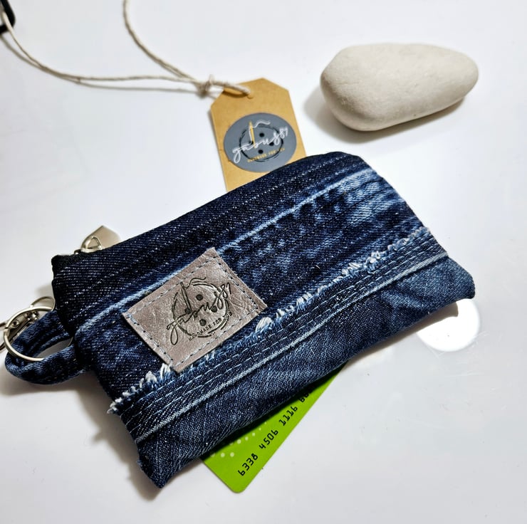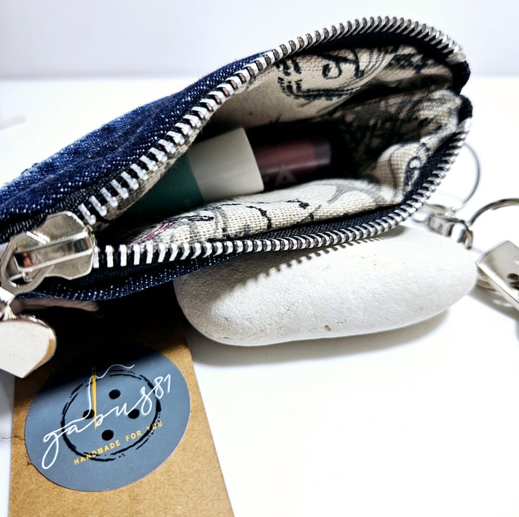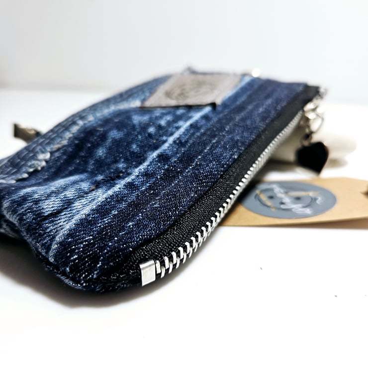 Crafted from reclaimed denim, this pouch keeps your keys and coins secure while reducing textile waste. The compact rectangular shape slips easily into purses, pockets, or backpacks.