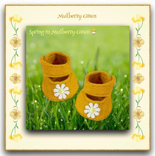 A cute little pair of golden yellow doll’s shoes, decorated with tiny daisies, to fit the Mulberry Green characters. The shoes look lovely with the little dresses in my shop.