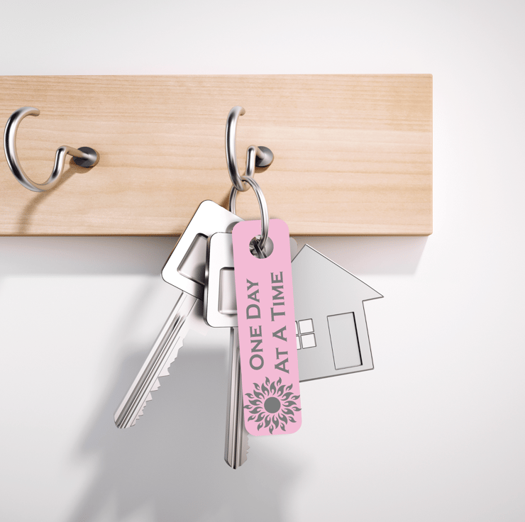 The "One Day at a Time" keyring serves as a daily reminder to embrace life's journey gradually, emphasizing the importance of resilience and mindfulness in navigating each day.
