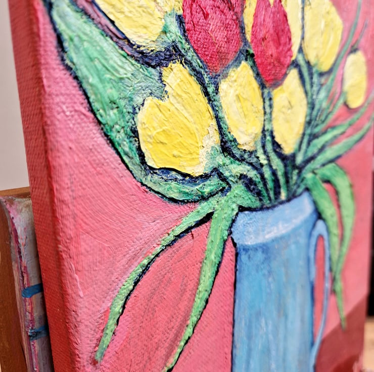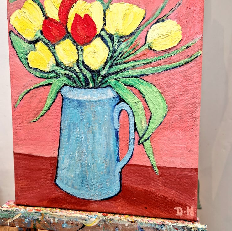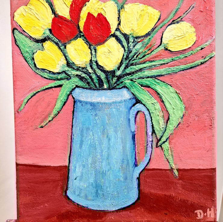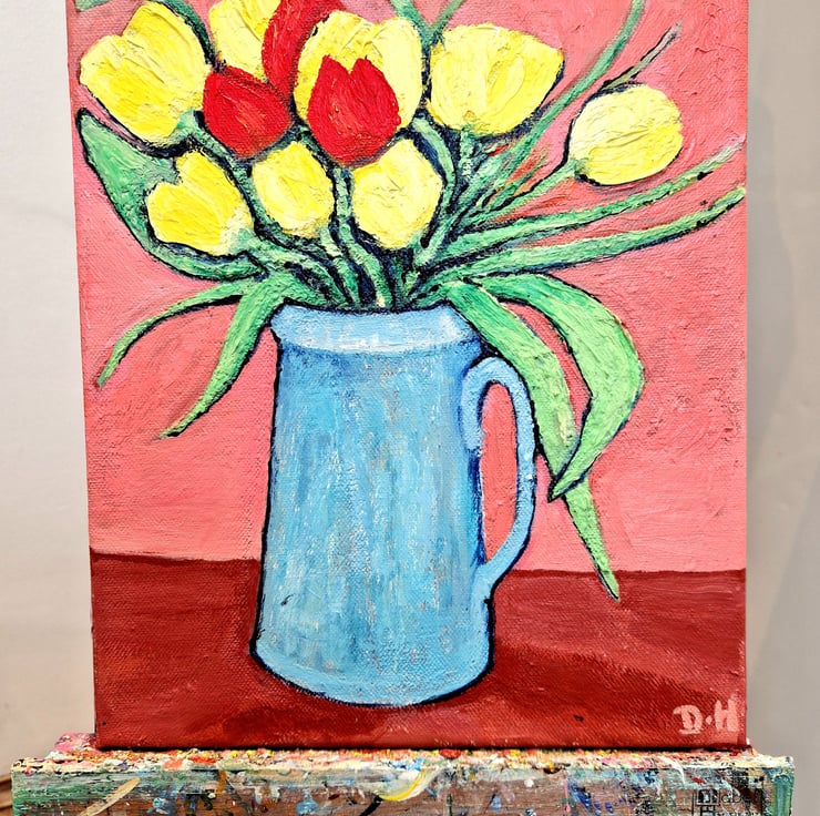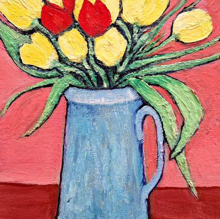 A contemporary, brightly coloured floral painting of red and yellow Tulips in a pale blue jug. The flowers stand out against a warm pink and red/brown background. They are textured and bold.