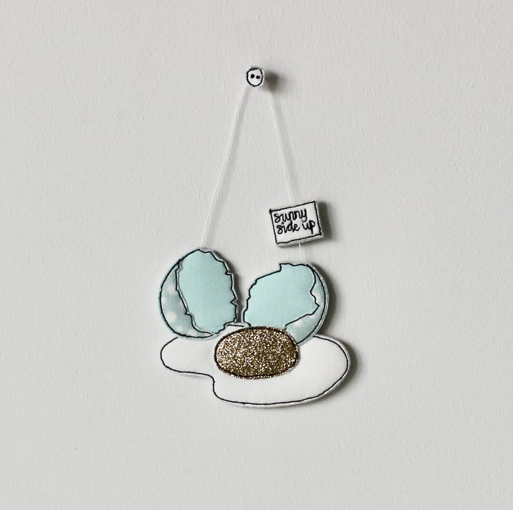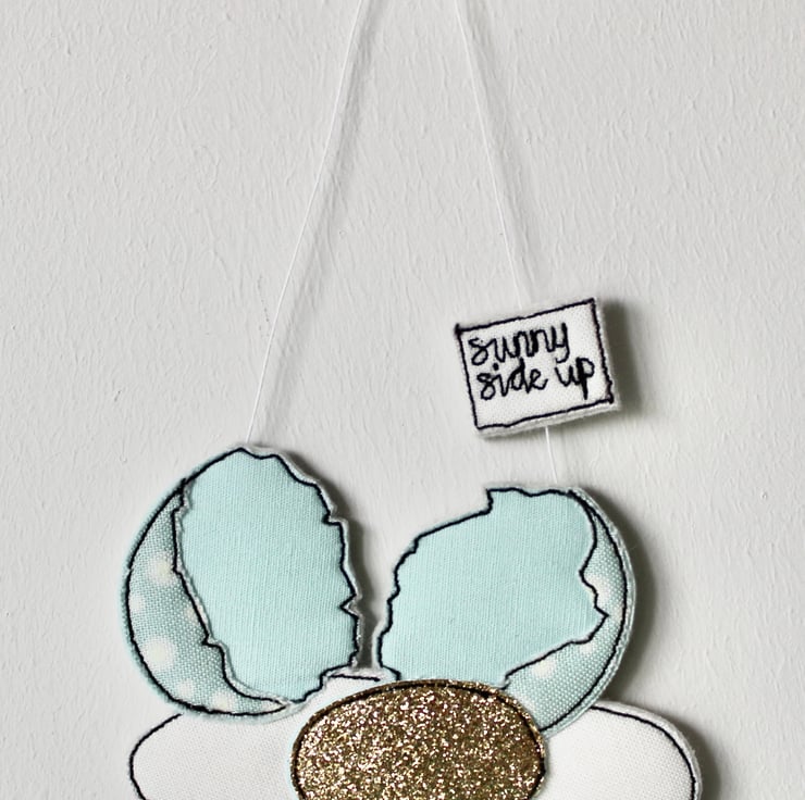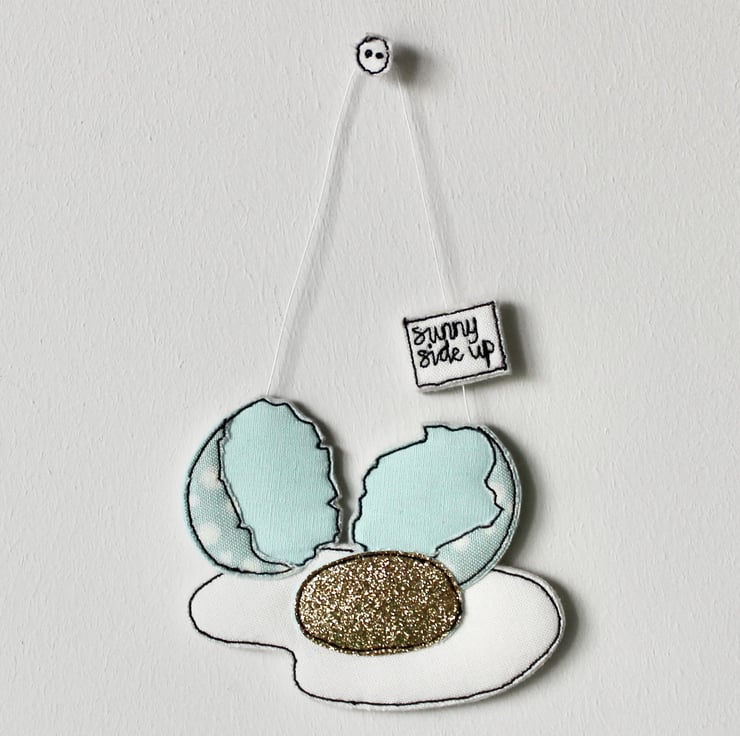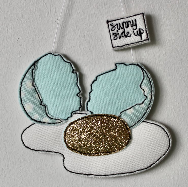 A little egg with its shell and the sewn words 'Sunny Side Up'!