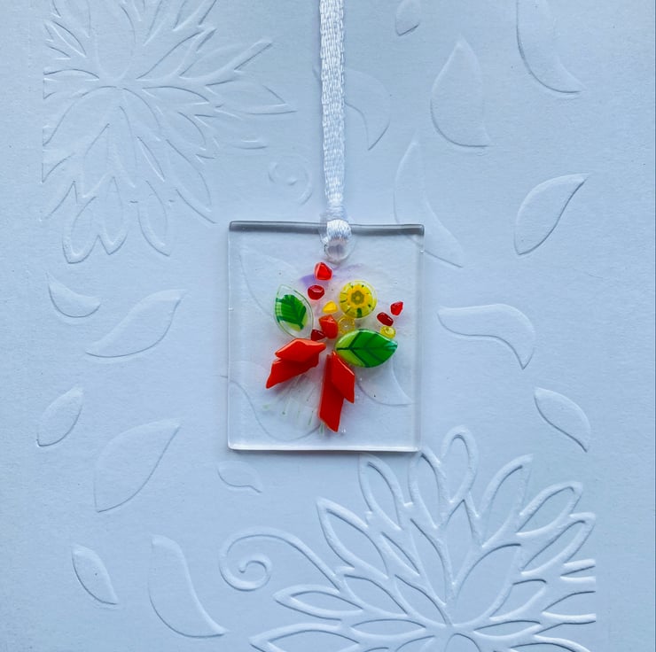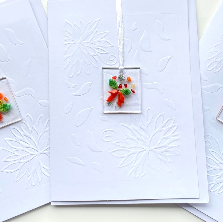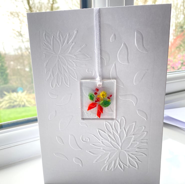 A lovely card - with a special murrine glass decoration which can be hang however you wish - these look stunning as a necklace or hung from wardrobes or on the Christmas tree . A perfect way to send a card and gift in one . The detail in the leaves and flowers in this bouquet are so pretty . The white card is also hand embossed to create a luxurious feel . The card is 7 x 5 inch and is blank inside for your own message . The glass is approximately 1.5 x1.5 inch and is drilled and strung with ribbon Please contact me if you’d like me to post direct to recipient . All of my cards come with free second class postage .