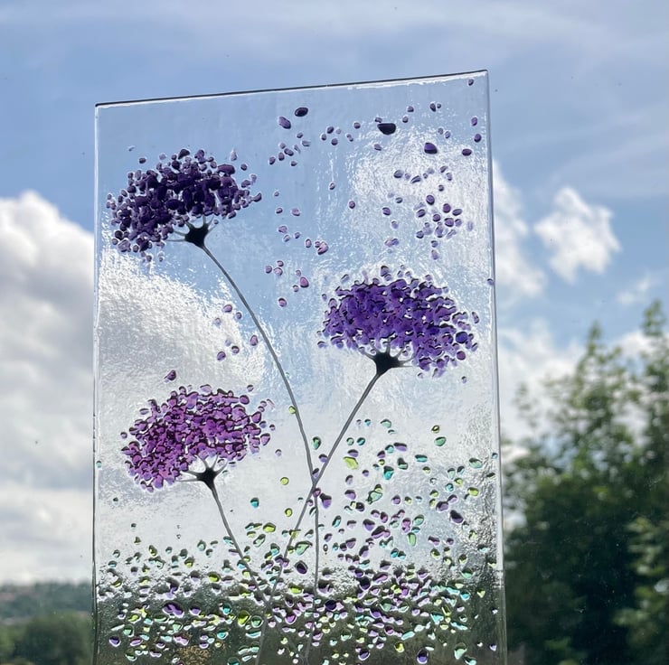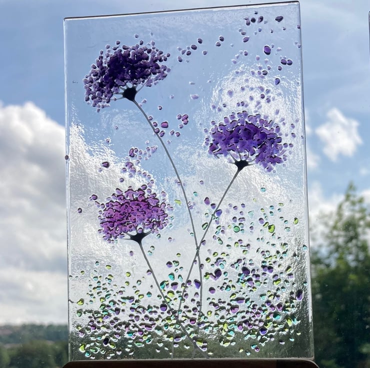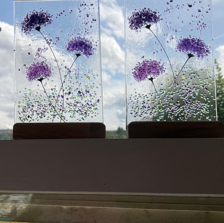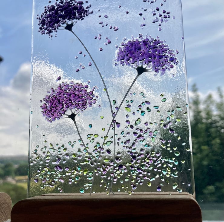 Purple mix whimsical Flower fused glass Art Picture Sun Catcher & Wooden Display