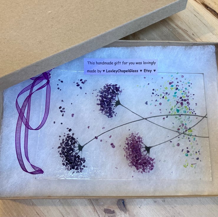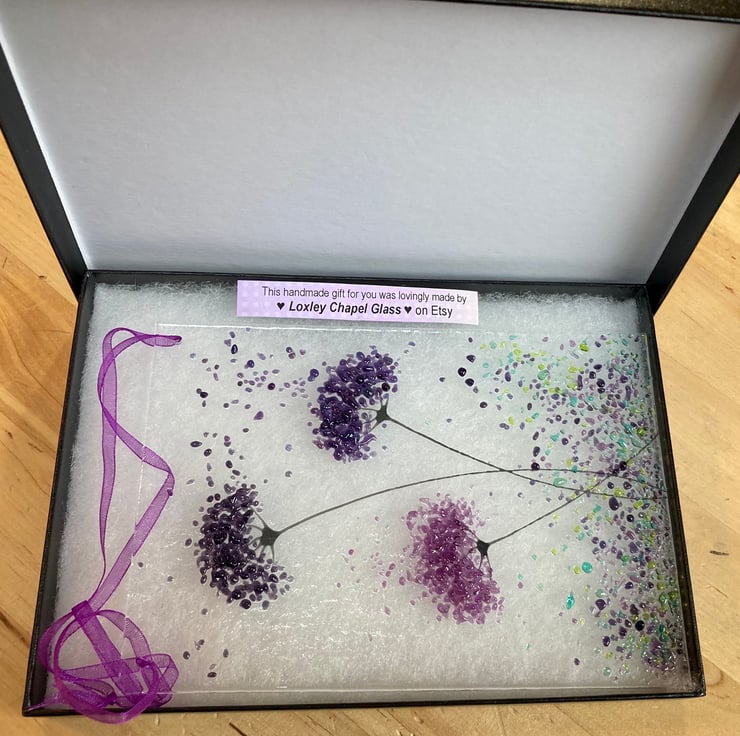 Every picture is individually made so no two are ever exactly the same, the glass picture comes complete with a wooden display stand or a hanging ribbon as selected.